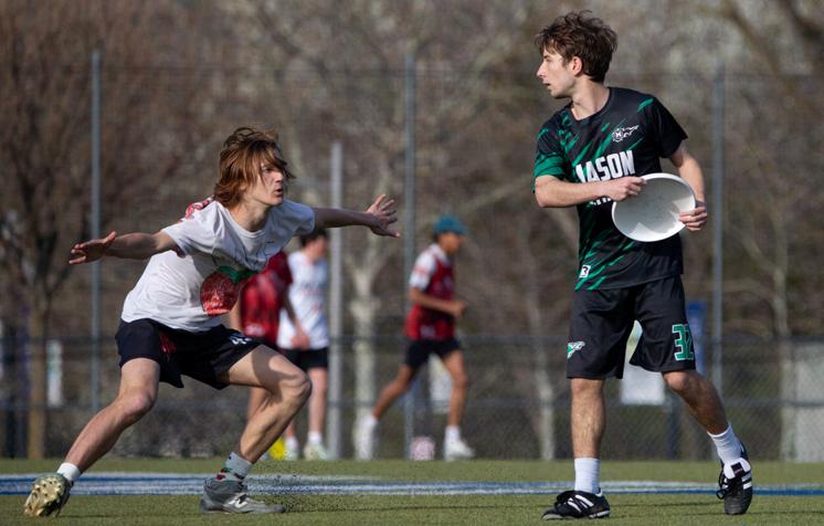 4: Leo Dolle (10) looks at the opponent’s movement on defense to get the disk back. Boys ultimate frisbee played in their first tournament of the season on March 21-22 in Virginia in hopes to clinch a spot at High School Frisbee Nationals. PHOTO: ETHAN LIN