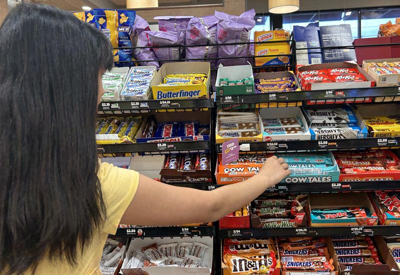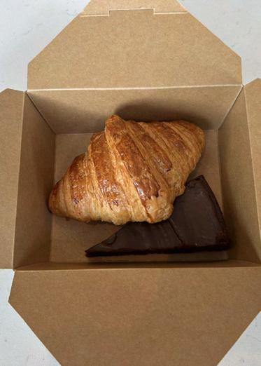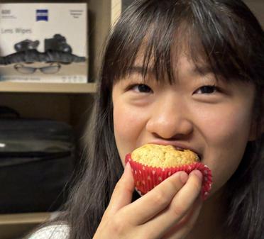 YUM! • Jane Yau ’29 dives into a delicious warm chocolate chip banana muffin during newspaper layout on April 18. PHOTO: ROWAN BROWN