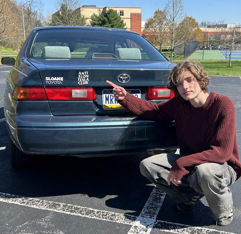 • Senior Theo Berkman-Lamm points to the bumper sticker on his car which reads “Anti Elon Tesla Club” PHOTO: MIA FAGONE
