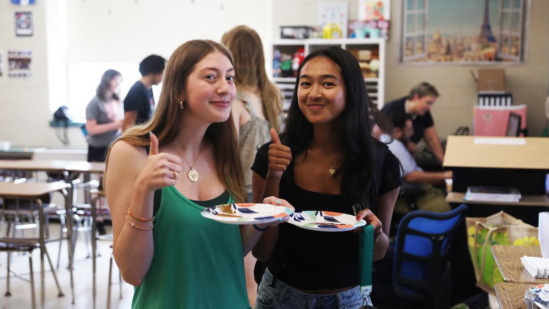 5: Magnolia Brown (12) and Daksha Nair (12) sample classic Belgian snacks, dipped in a rich, chocolate fondue. French Club and German club collaborated to organize Belgian Day on Thursday, April 16 as a tasteful opportunity for Haven students to learn more about the culture of a Francophone and Germanophone country. PHOTO: ETHAN LIN *