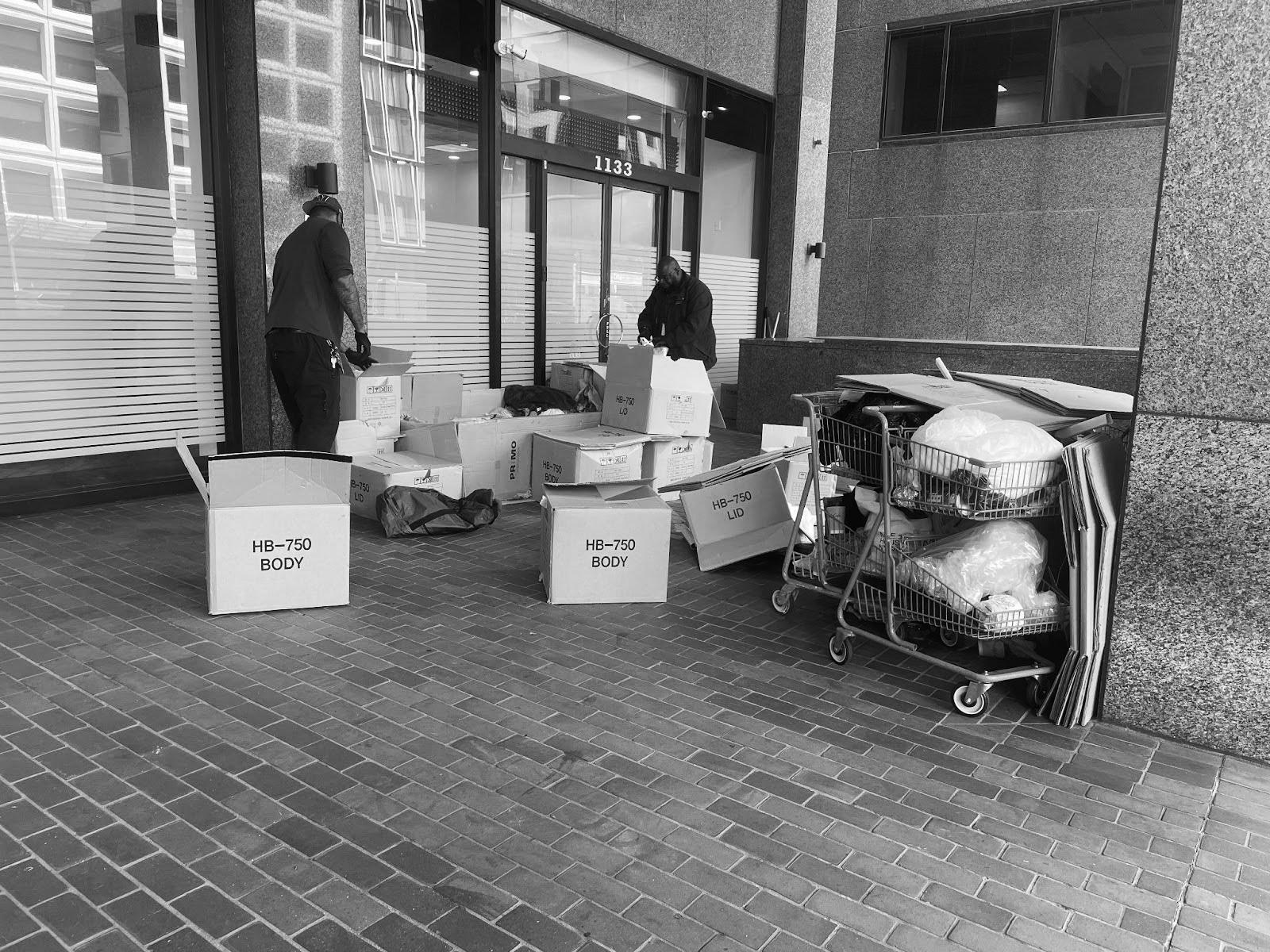 While the clearing at 1133 19th St. was scheduled to begin at 10 a.m. on March 13, DMHHS officials arrived at the encampment shortly before 11 a.m. The encampment, which was located in front of a highrise office building, appeared to have been occupied by only one individual, who was not present during the clearing. A sign near the street, at least 20 feet away from the site of the encampment, notified readers of the planned clearing.