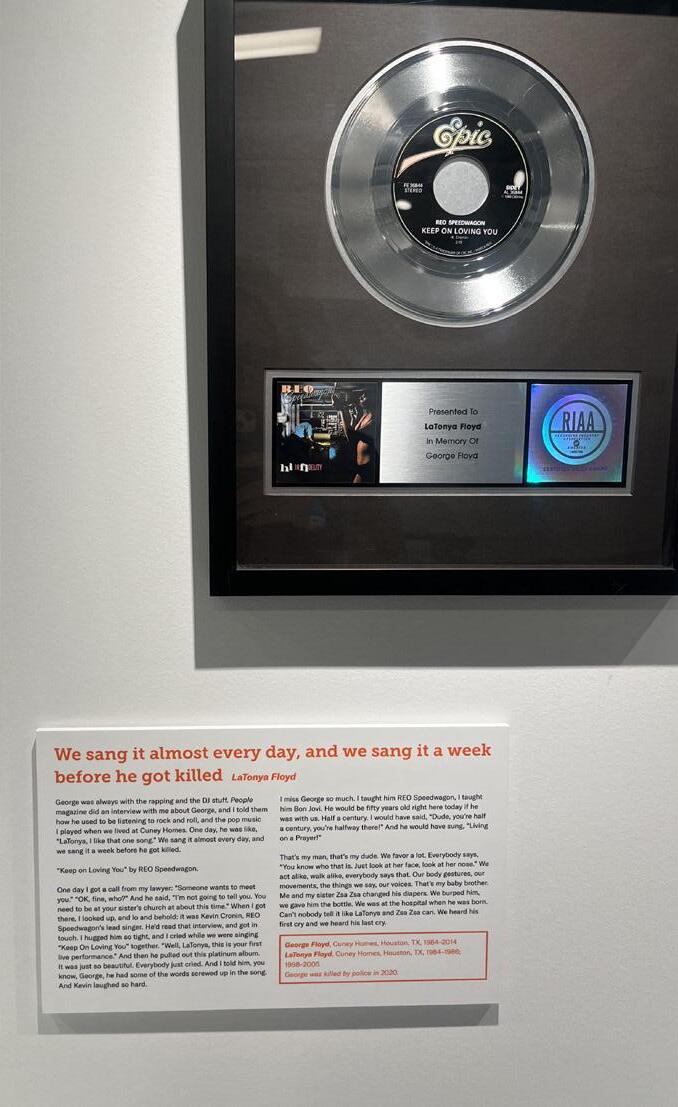 • A Platinum Copy of REO Speedwagon’s “Keep on Loving You” (1980) from LaTonya Floyd, who lived in the Cuney Homes of Houston between 1984 and 1986, because she and her brother, George Floyd (Cuney Homes 1984-2014), sang it almost daily in the week before he was killed by police in 2020. A member of REO Speedwagon presented it to her.