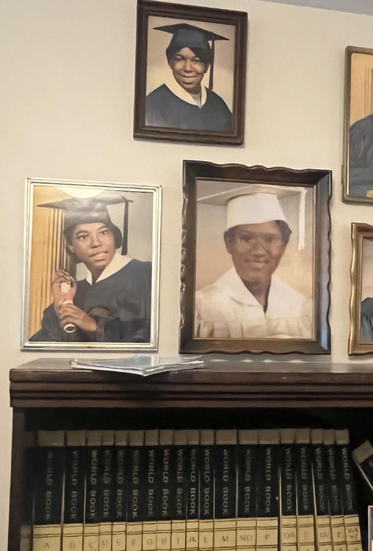 People on the guided tour also reacted with recollection and delight to the still lifes in the Hatch apartment. Family members’ cap-and-gown graduation portraits line the wall just above the living room bookcase filled with a set of World Book