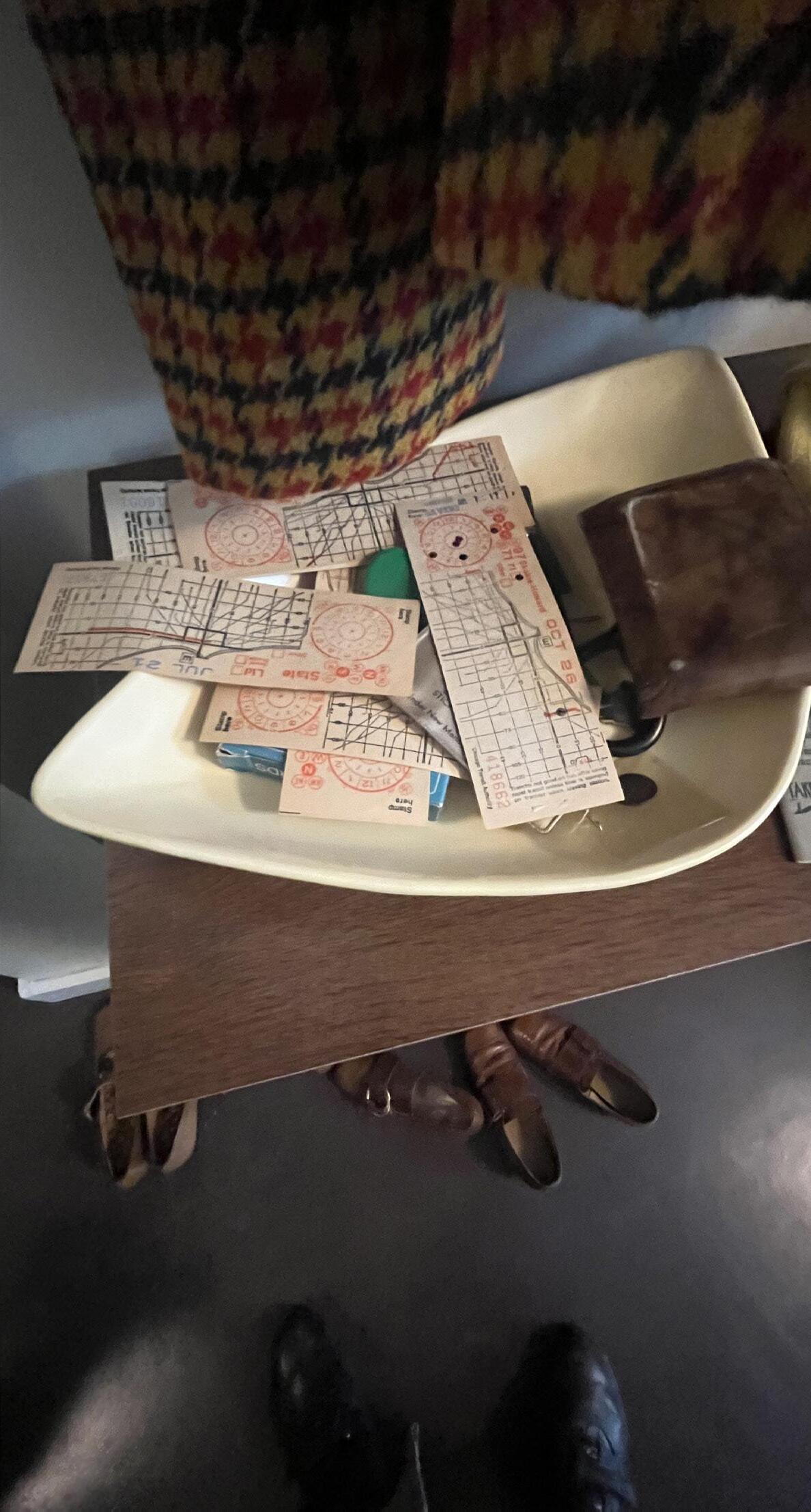 encyclopedias (because Mother Jackson valued education). Across the room, a lit-up Jesus portrait hangs above the TV and tables with the 1968 Sears Christmas catalog, an embroidered hankie, and an Art Moderne ashtray filled with Chicago Transit Authority paper transfers used for multiple rides.