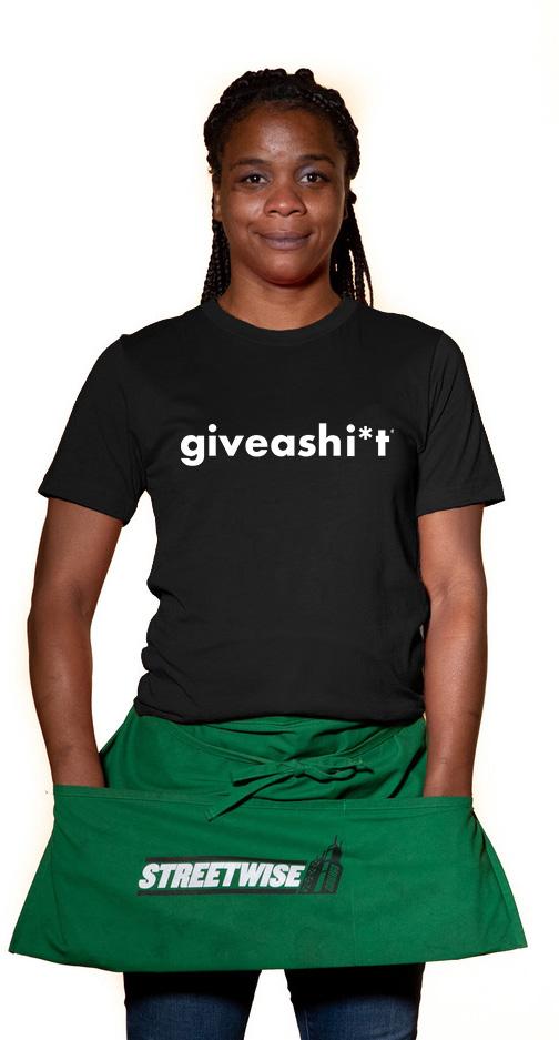 THIS PAGE: StreetWise Vendor Kianna wears the GiveAShi*t logo shirt (Daily Planet, Ltd. photo). DISCLAIMER: The views, opinions, positions or strategies expressed by the authors and those providing comments are theirs alone, and do not necessarily reflect the views, opinions, or positions of StreetWise.