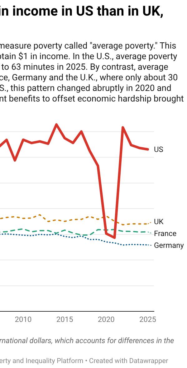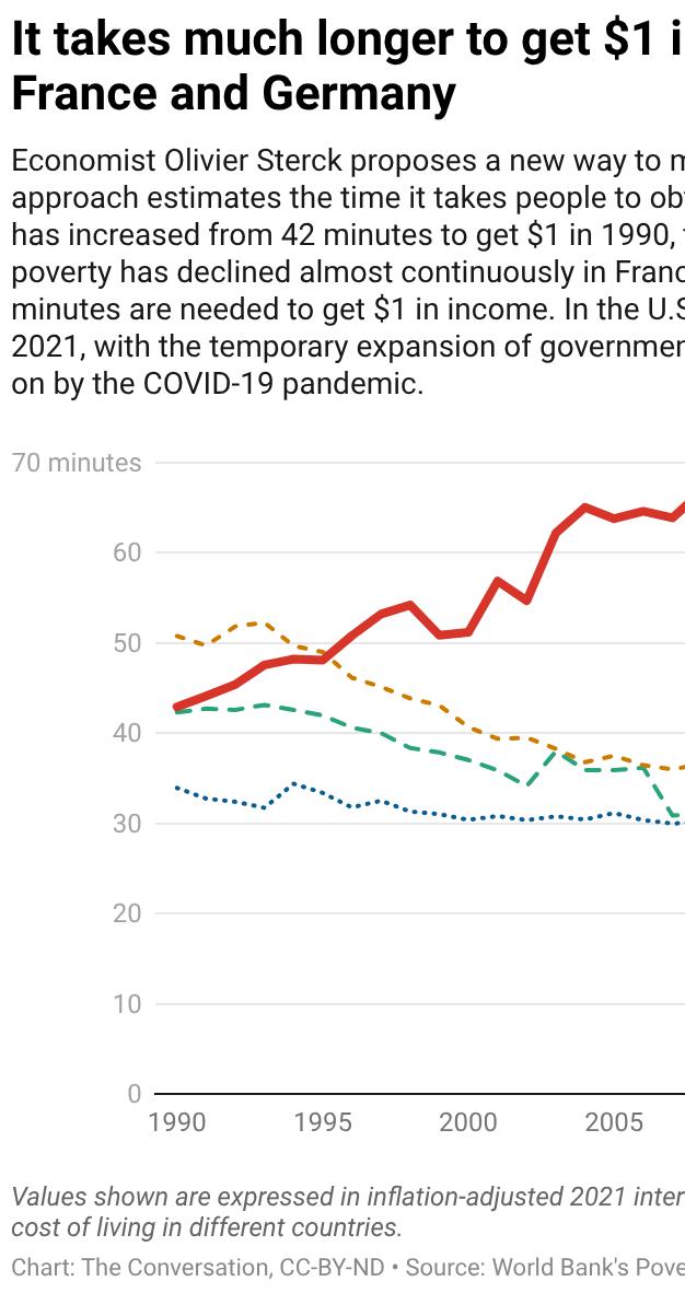 My proposed measure casts the U.S. in a strikingly different light from traditional poverty statistics. In the U.S., I’ve calculated that it takes 63 minutes on average to get $1 in income. That’s much slower than in many other highincome countries: