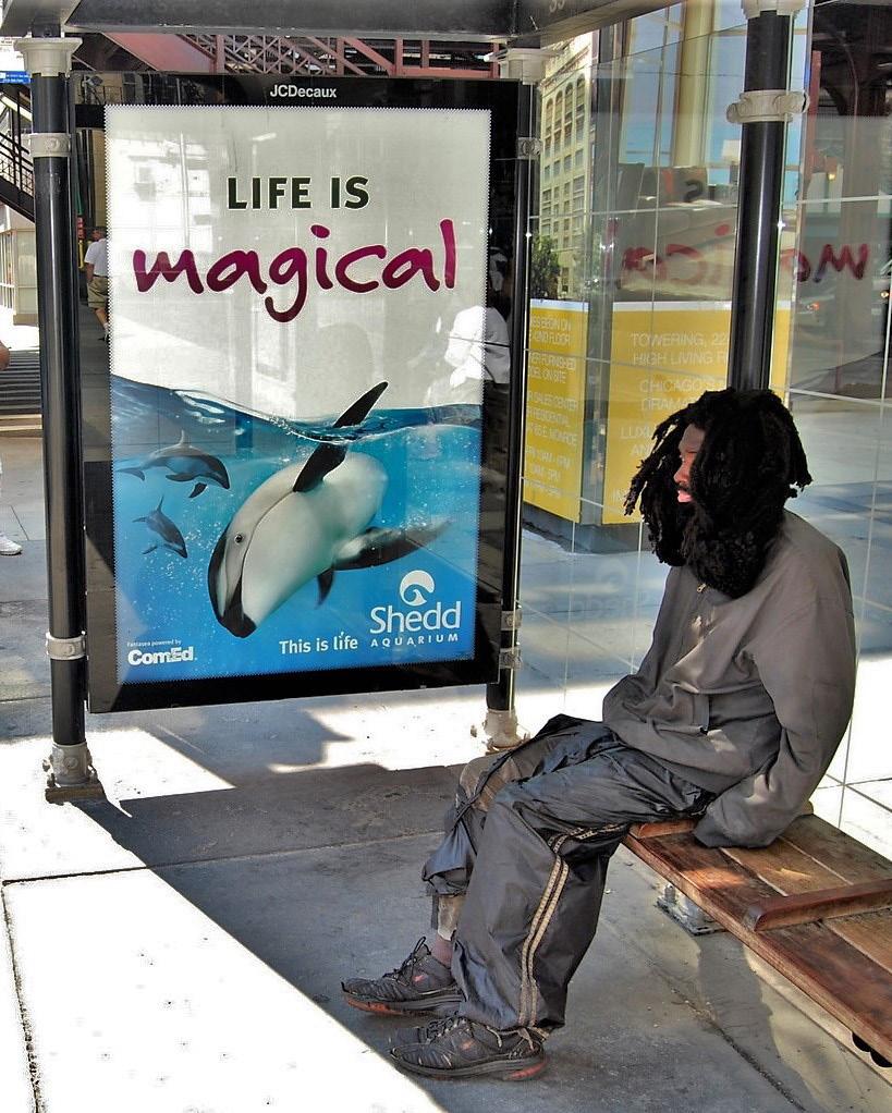 LEFT: This man was a regular in the Loop for years. He fished through trash cans and kept to himself. I never saw him talk to another human being. I always wanted a portrait to go with the unposed pictures I took and I always offered him money. I went as high as $50 but he always said I don't do photos. When one day I saw him sitting at this bus stop next to the “Life Is Magical” sign it was without question a photograph I had to take. One of my best photos ever with a message that I thought had to be seen. I haven't seen him in two years.
