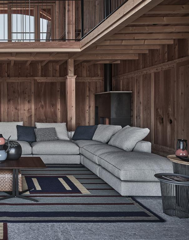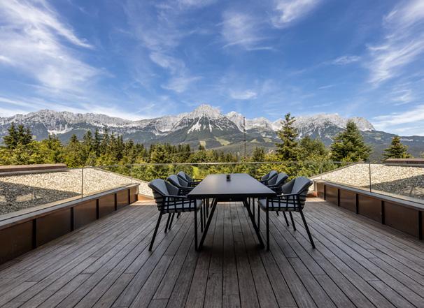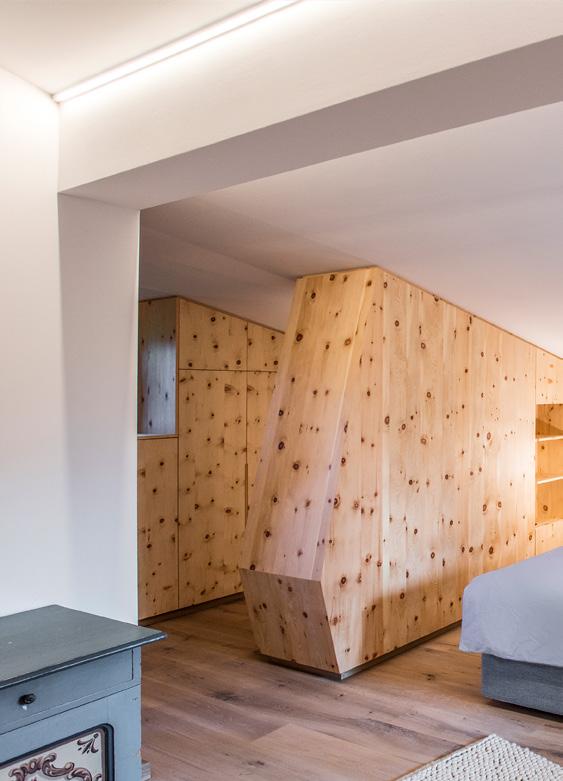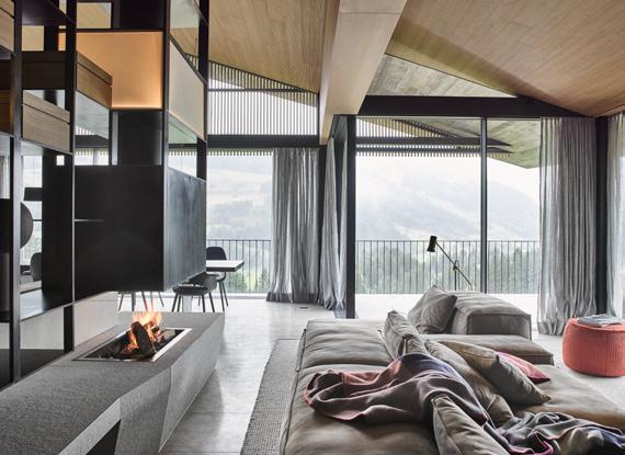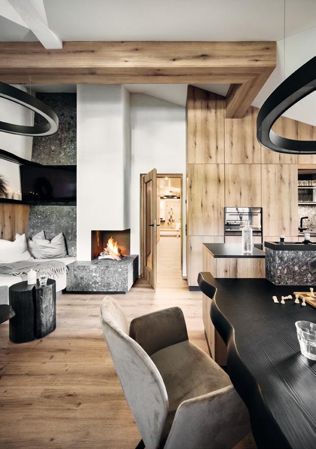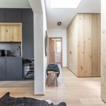 So sind Haptik und Optik eine harmonische Einheit, wie das Einfamilienhaus in der Kochau in Aurach bei Kitzbühel allein von außen schon erkennen lässt. Eine Hülle aus Beton und Holz verschmilzt fast naht los mit der Landschaft, in die sie eingebettet ist – eine atemberaubende Lage, die dazu verführt, dass das Verbinden von Drinnen und Draußen zu einer Ein heit wird. Die Aufgabe war es, für eine Familie mit zwei Kindern ein Raum- und Interiorkonzept auf drei Etagen zu entwickeln, das einerseits sehr funktional angelegt ist, andererseits für jede Gelegenheit beson ders einladend wirkt – seien es die individuellen Rück zugsorte der Familienmitglieder oder die gemeinsam bespielte, offene Wohnküche, die – äußerst spannend – nicht im Erdgeschoss, sondern im Dachgeschoss angesiedelt wurde.