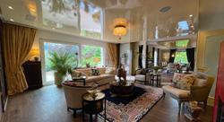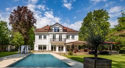 Diese außergewöhnliche Villa überzeugt mit ihrem luxuriösen Flair und ihrem großzügigen Raumangebot: Auf insgesamt vier Etagen erstrecken sich ca. 572m2, verbunden mit einem Personenaufzug. Vom großzügigen Eingangsbereich aus gelangen Sie durch verglaste Flügeltüren direkt in den exklusiven Wohn- und Essbereich. Ob der Kamin oder die breite Fensterbank – es finden sich an jeder Ecke de taillierte Highlights für ein Wohnambiente der Extraklasse. Durch eine versteckte Schiebetür gelangen Sie in die hochwertig ausgestattete Küche. Neben einer separaten Speisekammer finden Sie einen gemüt lichen Sitzbereich mit Platz für die ganze Familie. Der direkte Zugang zum überdachten Freisitz garantiert kurze Wege zum BBQ-Abend. Im Obergeschoss befinden sich insgesamt vier Kinderzimmer mit bis