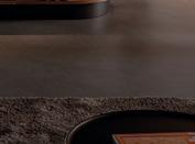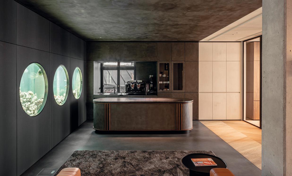 So sprechen die Materialien schließlich eine gemeinsame Sprache: Der Beton präsentiert sich von seiner raffinierten Seite – rau und doch nahbar in seiner Struktur. Der Amerikanische Nussbaum –edel und unerreicht in seiner unverkennbaren, satten Färbung – bildet die Basis für die gesamte Einrichtung. Architektonische Akzente setzen wertige Bronzeoberflächen in fließenden Raum kompositionen, die mit weichen Stoffen und feinen Textilien sanft abgerundet werden. Deutlich wird hier einmal mehr die ambitionierte Vision der Marke Bernd Gruber, die in kompromiss loser Perfektion und mit großem Erfolg ihre eigenen hohen Maß stäbe im Spannungsfeld zwischen handwerklicher Tradition und modernem Interior Design setzt.