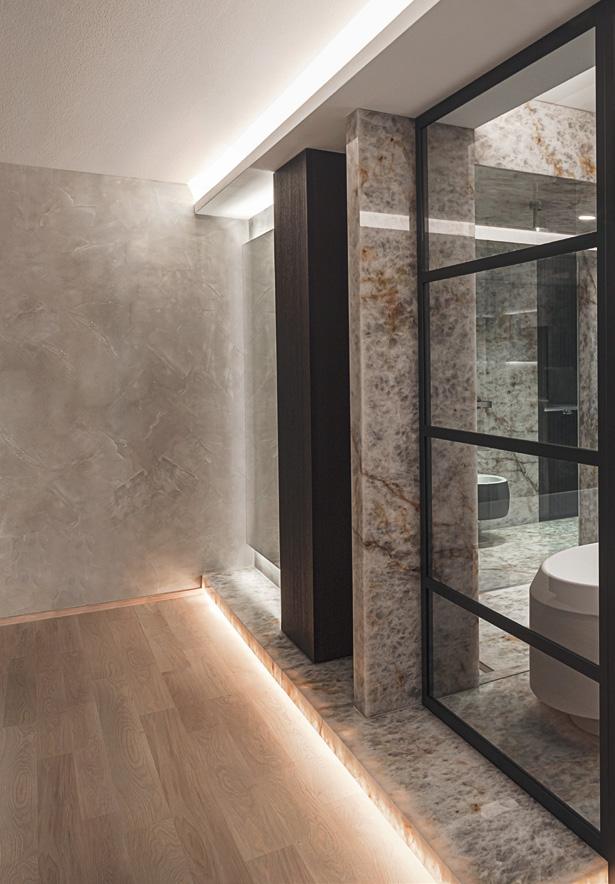 im angrenzenden, über eine Schiebetüre teilbaren, privaten Bereich. Die Bäder sind mit großformatigem Feinsteinzeug und Einbauten ausgestattet. Imposante Aufsatzschalen-Waschbecken und große Duschen geben den Bädern das entsprechende Flair. Die Infrastruktur ist absolut perfekt.