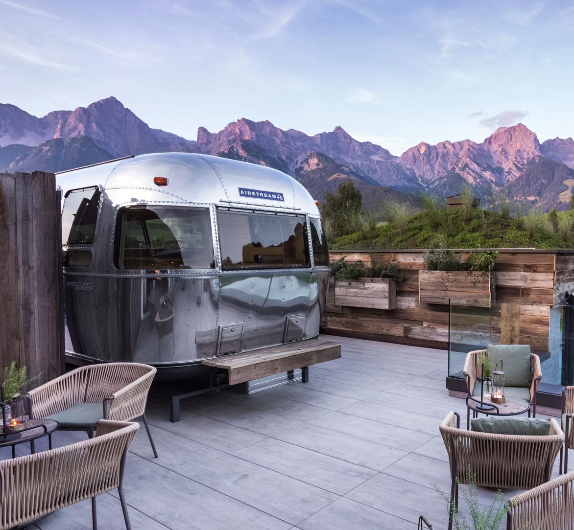 Schön luftig geht es zu auf dem Rooftop mit Dachterrasse. Dazu der Blick über den Ort und das Steinerne Meer mit seinen scharfkantigen Gipfeln. Dass es hier oben plätschert, liegt am großzügigen, beheizten Infinity-Pool. Lieber das Buch auslesen oder in der Heißluftsauna im umgebauten Airstream dösen? Der Oldtimer-Wohnwagen aus den USA ist Kult und macht auch am Hotel SEPP so richtig Spaß – der Blick aus dem Airstream nach draußen über die Berge ebenso.