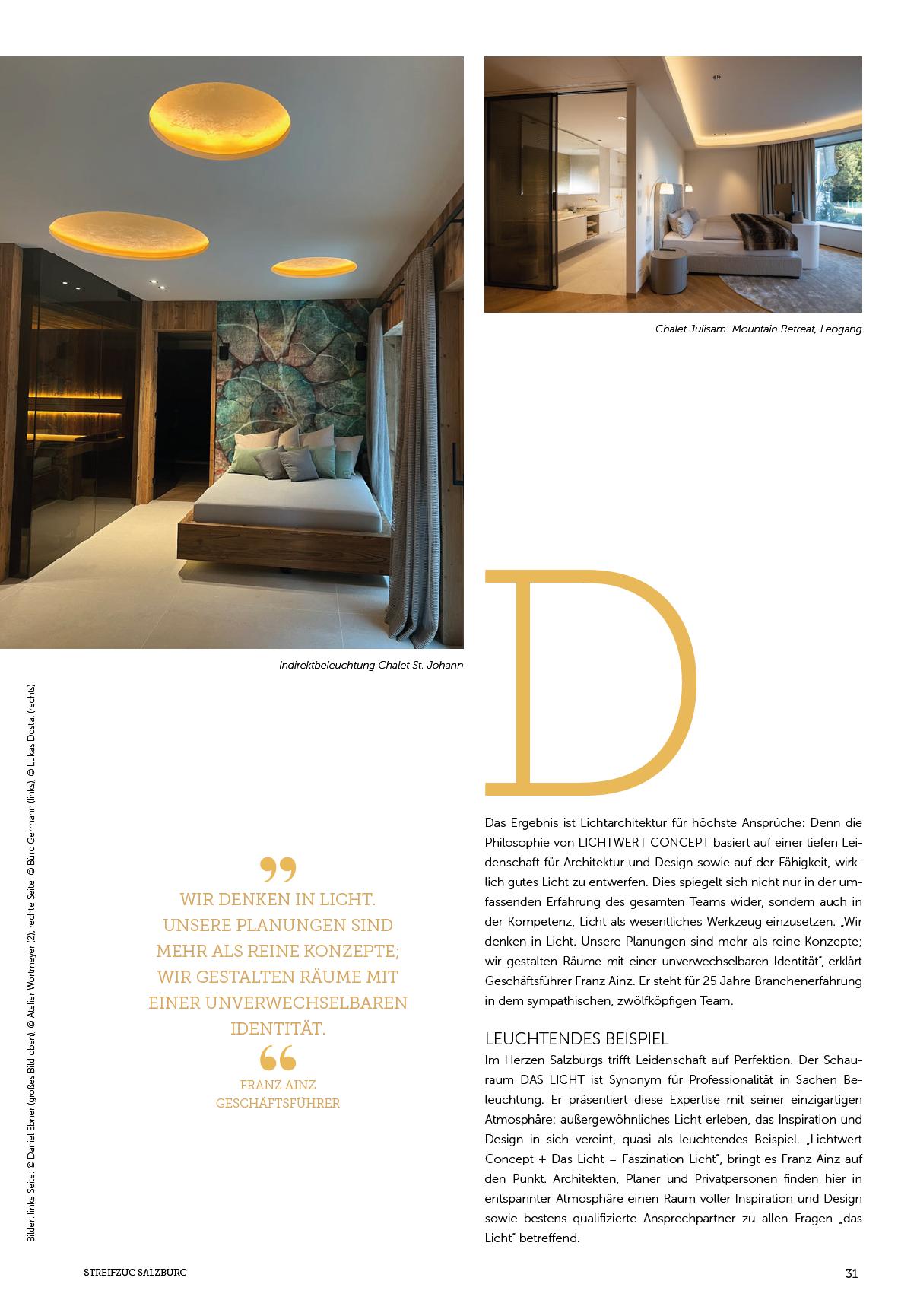 Jede Planung von LICHTWERT CONCEPT erzählt eine einzigartige Geschichte, die stets den Charakter und die Funktion des jeweiligen Objektes in den Vordergrund stellt. Die Kompetenz reicht von architektonischen Großprojekten bis hin zu anspruchsvollen privaten Wohnräumen. Jedes Lichtkonzept wird sorgfältig auf die individuellen Bedürfnisse zugeschnitten, um eine besondere Verbindung zwischen Licht und Raum zu schaffen. Design, State-of-the-Art Lichttechnik, Kompetenz und jahrzehntelange Erfahrung fließen ebenso nahtlos in die Planung mit ein. So wird nicht nur eine visuelle und funktionale Wirkung erzielt, sondern auch eine einzigartige Stimmung geschaffen – zwischen Ursprung und Zeitgeist … immer am Puls der internationalen Trends. Mit individuellen, außergewöhnlichen Lichtkonzepten realisiert LICHTWERT CONCEPT so Menschen ihren Lebens(t)raum und ihre persönlichen Wirkstätten. „Was dabei herauskommt, ist elegant, edel und immer charmant“, so Franz Ainz.