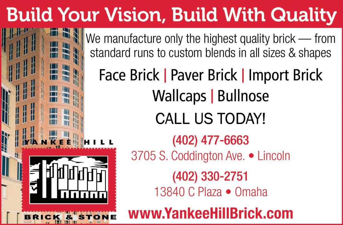 Burner Watchperson—Responsible for monitoring all functions of the kiln, drier, and transfer cars to ensure proper operation. Work schedules comprise a 10-hour shift, including night shift, with weekend availability and overtime opportunities. Benefits include health/dental/vision/life insurance, paid time off, 401(k) and 401(k) matching, flexible schedule, tuition reimbursement, flexible spending account, and a health savings account. To learn more about a possible career with Yankee Hill Brick, visit www. yankeehillbrick.com/careers or call (402) 477-6663.