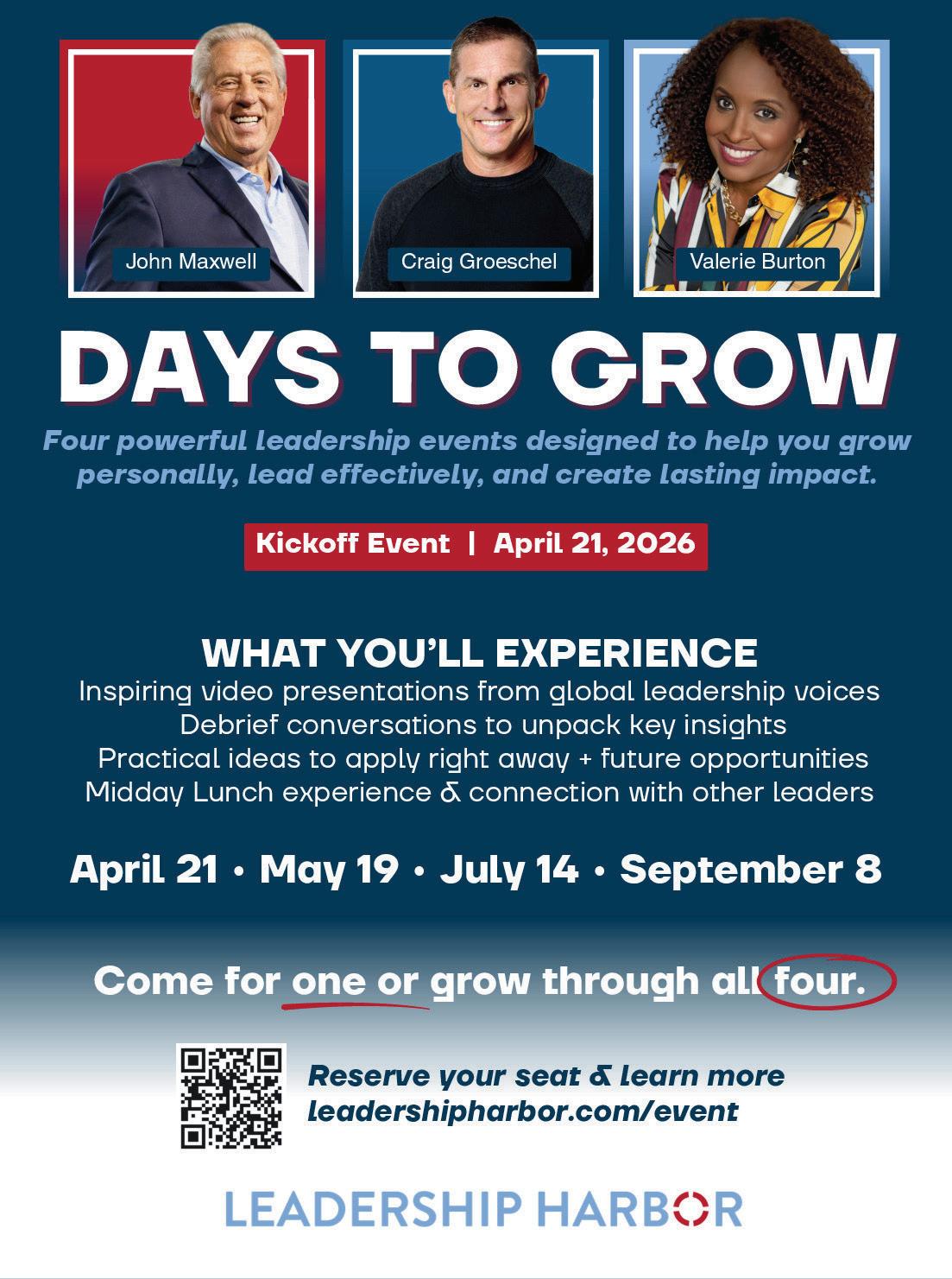Leadership Harbor invites leaders, professionals, and growth-minded individuals to participate in the 2026 Days to Grow series—four powerful opportunities throughout the year designed to inspire, challenge, and equip participants for greater leadership and personal development. Each session features a video presentation from world-class speakers including John Maxwell, Valerie Burton, and Craig Groeschel, followed by a guided lunch debrief designed to help attendees process key insights and practical application. Participants may attend one, two, three, or all four sessions throughout 2026.