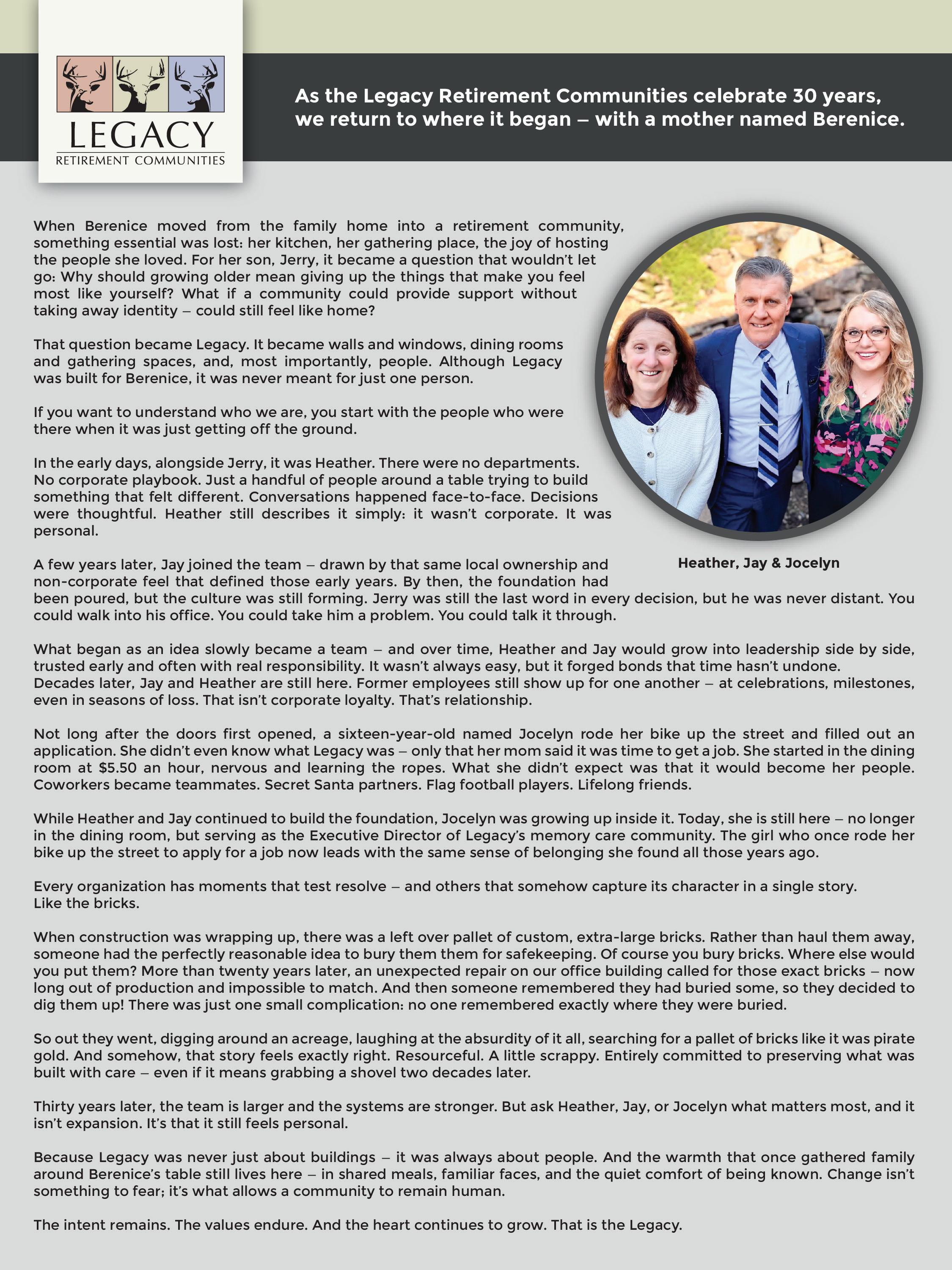When an unexpected life event requires families to explore care options sooner than they planned, they are often trying to process a lot at once—medical information, logistics, and emotions. Needing to decide quickly doesn’t mean sacrificing the ability to make an informed decision. The role at Legacy Retirement Communities is to help families slow the process down just enough to understand their options and feel confident in the path forward. They begin by listening and learning about what has changed. Understanding the immediate concern—whether it’s safety, health needs, or support at home—helps everyone get clearer about what the next step might be.