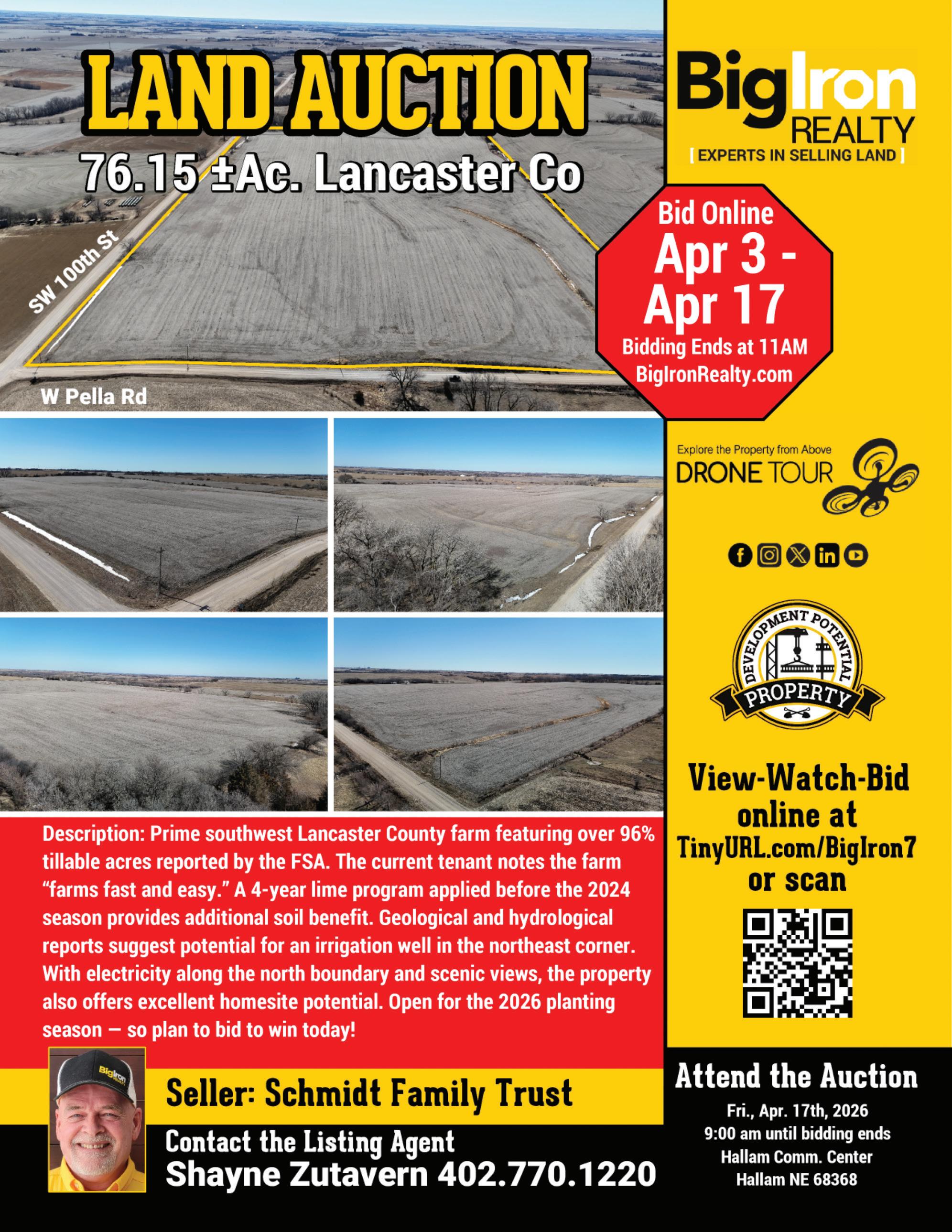 A high-quality 75.16± acre farm in southwest Lancaster County will be offered for sale through an online land auction conducted by BigIron Realty. Bidding opens April 3, and closes April 17, at 11 a.m. Central.