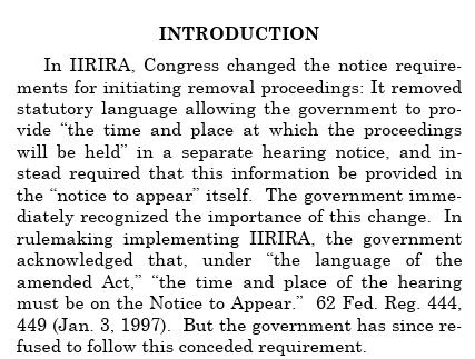 – To initiate removal proceedings, the government must serve “a notice to appear.” The statute requires that the “notice to appear” include specific information, including the “time and place” of proceedings.