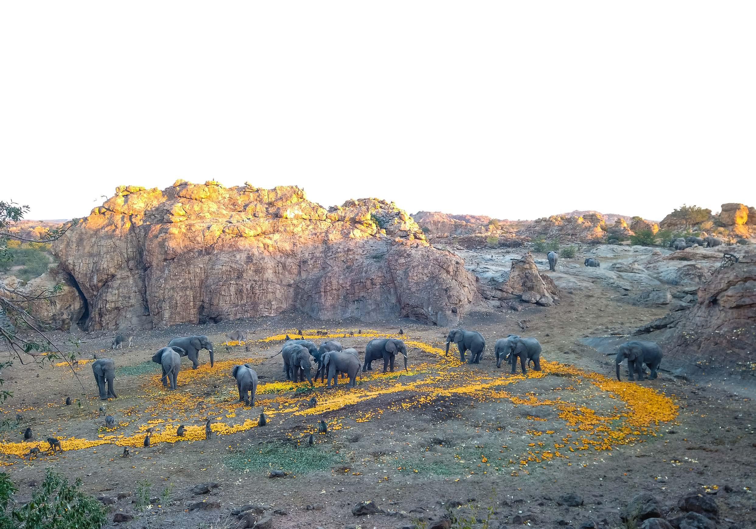 This serves as a vital conservation practice, as citrus is acidic and can damage soil in large quantities. Through the consolidation of discarded fruit and pulp, the camp’s environment is protected, and wildlife receives a beneficial citrus supplement. The true wonder, not seen anywhere else under the sun, lies in witnessing up to 200+ elephants, along with baboons and other animals, congregating each night to feast.