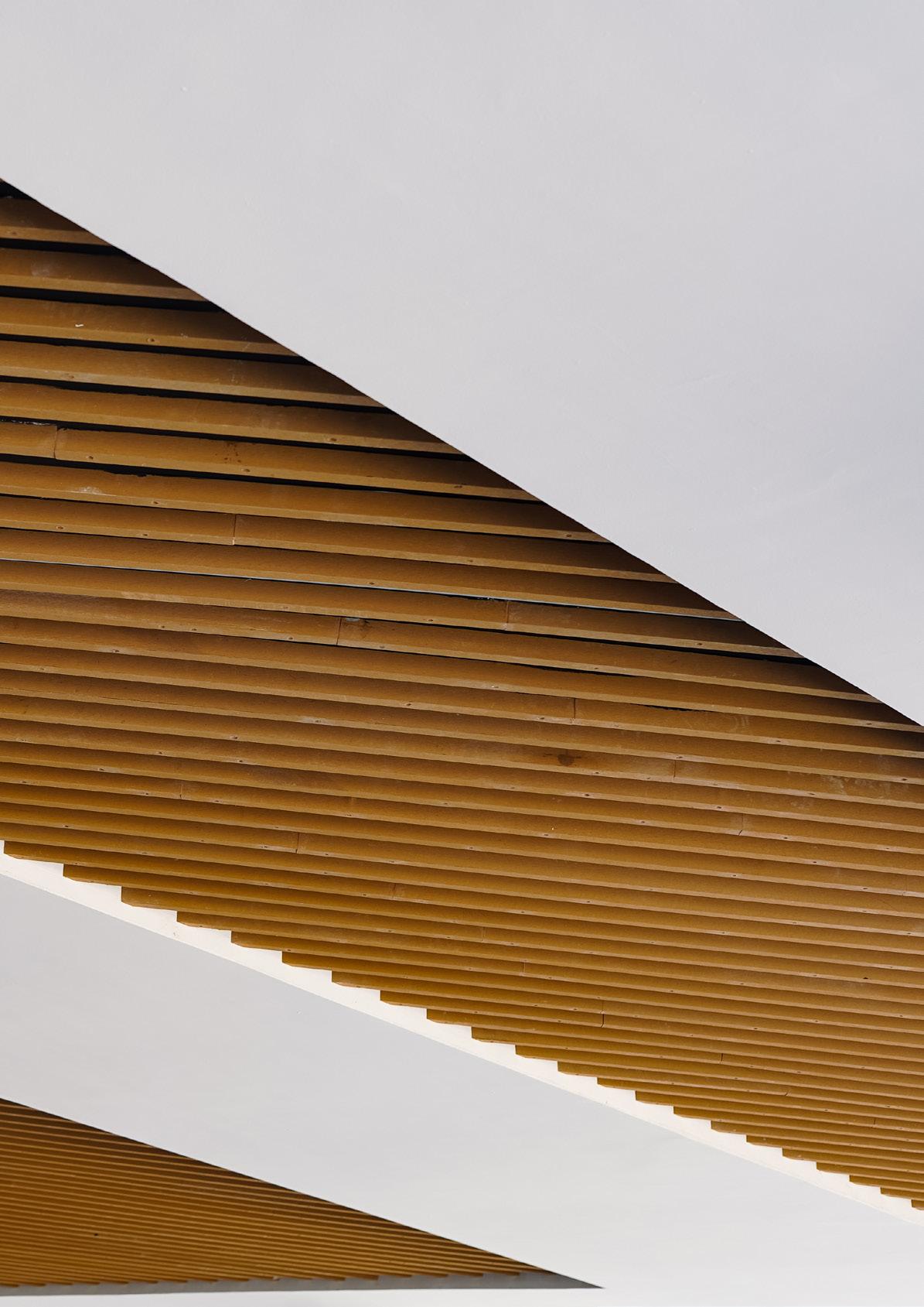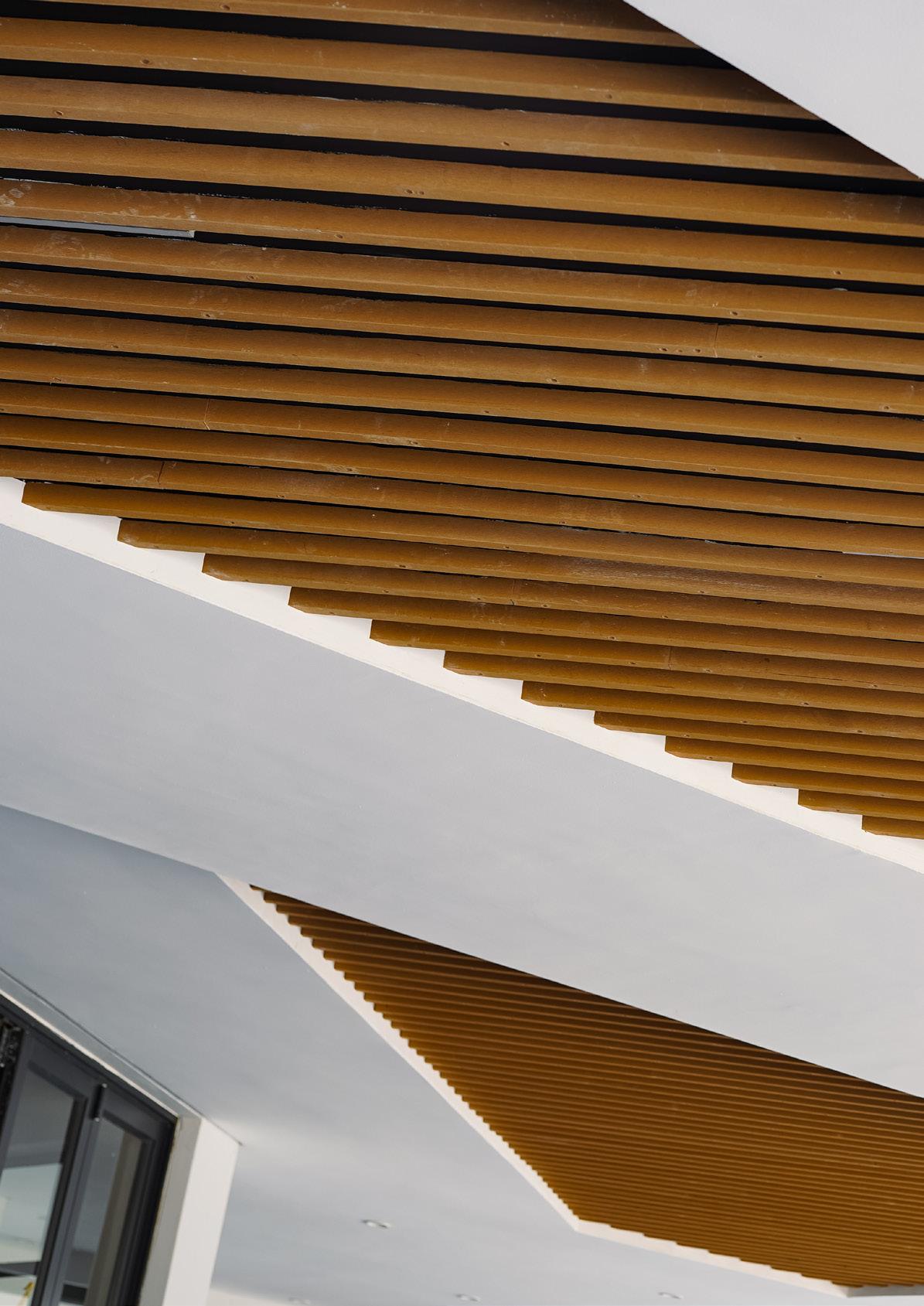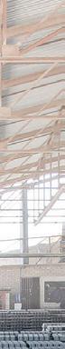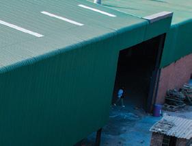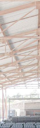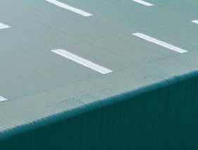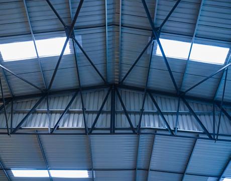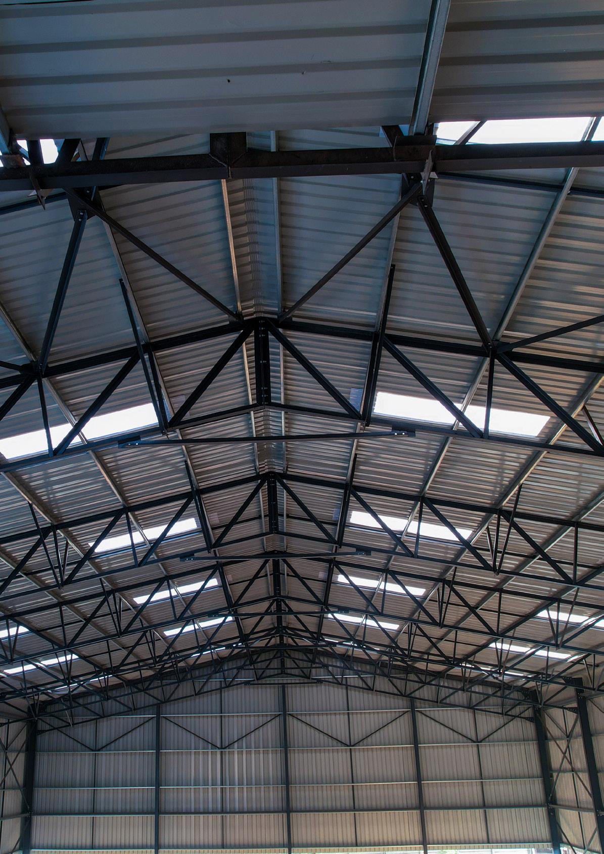 The roof is a defining feature of the new warehouse. It is composed of a symmetrical metal truss system that supports corrugated metal roofing. A major design element is the integration of numerous rectangular skylights, which are evenly spaced across the roof. These panels allow natural light to flood the vast interior, creating a bright and energy-efficient workspace. This deliberate use of natural light is a testament to the modern, sustainable approachtaken in the building’s design.