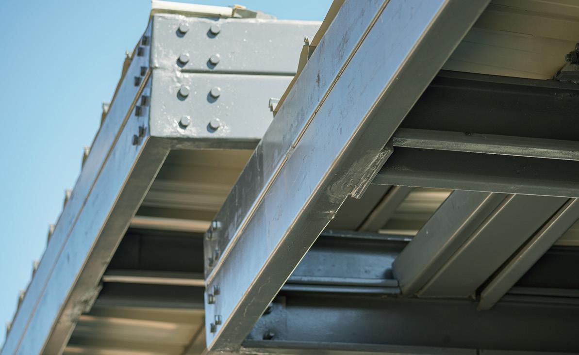 A series of black-painted steel columns, anchored to robust concrete footings, provides the skeletal support for the entire structure. Close-up images captured during construction highlight the precision of these foundational connections, secured with large bolts and nuts, and reinforced with diagonal support beams. This attention to detail in the structural framework ensures the building’s long-term stability and integrity.