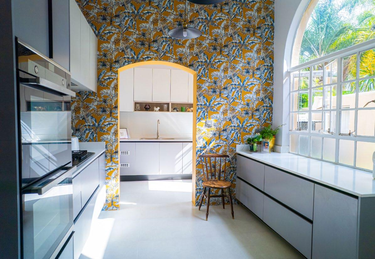 The wallpaper was installed in the kitchen (and bathrooms) by Guy Anderson from the company called Your Walls. The kitchen is very minimalist and modern but an antique Quaker style chair breaks the severity.