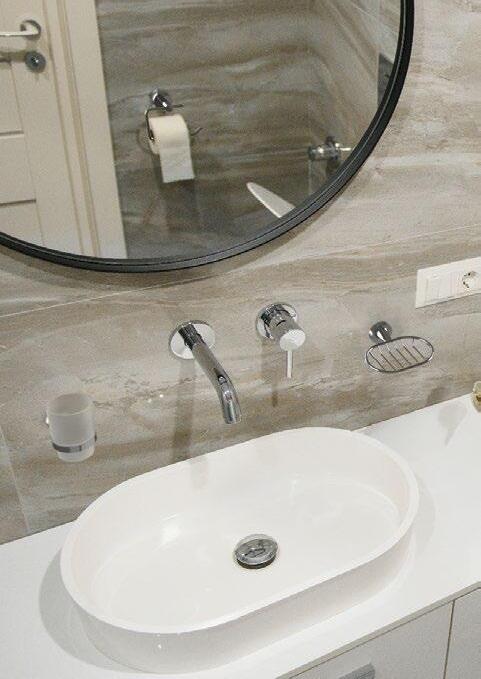 Lighting throughout the office wing utilizes recessed square LED panels to ensure low energy consumption while maintaining maximum luminosity. On the upper mezzanine level—a spacious open-plan area with light-colored floor tiles imported from Dubai for their longevity—the lighting takes on a more artistic form. A three-tier “halo” chandelier hangs over a central floor opening, casting a shimmering glow through integrated LEDs and textured crystals.