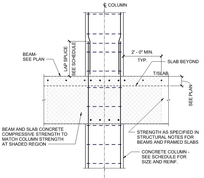 Another example is puddling at concrete columns which consists of placing higher strength concrete in the slab around a column before the rest of the slab is placed (Fig. 1). Discussion with the contractor may dictate if it is cheaper to puddle, increase the specified floor plate compressive strength, or increase the column size to reduce its required specified compressive strength.