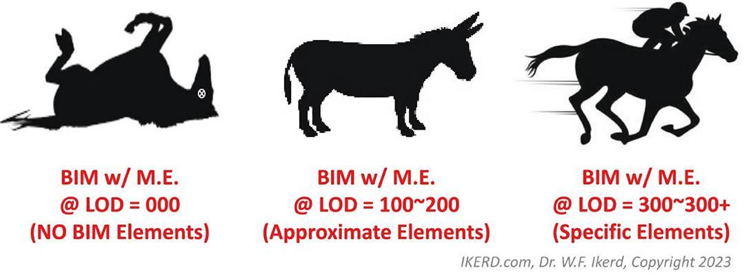 Figure 2 Analogy of a dead horse, donkey, and thoroughbred (LOD 000, 100~200, & 300~300+ respectively) for Level of Development (LOD) of Model Elements (ME) in BIM. The moral of the analogy is that you should not contractually promise that someone is entitled to receive a thoroughbred from you and then only deliver a donkey or a dead horse.