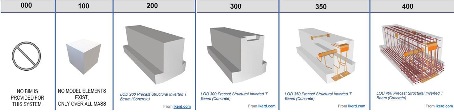 Several resources are available for SEs to learn more about concrete BIM and what they should consider in their general notes and specifications. Since 2008, the SEI Digital Design (formerly BIM) Committee (SEIbim.org) has maintained BIM resources. Since 2017, Ascend Building Knowledge Foundation (AscendBKF.org/STRUCTURES), a 501c3 non-profit, began focusing on research and training that included work in structures from design to construction. Resources for SE firms are provided at this site with sample general notes, BIM specification language, and sample BIM Execution Plans. In early 2022, the American Concrete Institute (ACI) published ACI PRC-131.3-22, TechNote “BIM Level of Development for CIP Concrete” (ACI BIM LOD 22), which does have some valuable information for SEs to consider, particularly the seven subcategories of concrete. These categories are (1) Concrete, (2) Reinforcing bar, (3) Specialty reinforcements, (4) Prestressing, (5) Specialty systems, (6) Embedments, and (7) Formwork. However, the ACI document references older AIA LOD 2013 definitions. In late 2022, AIA published its updated LOD definitions, which are the current definitions for new projects that reference them. SE firms should address the ACI BIM LOD TechNote-22’s seven categories of concrete BIM in their contracts, general notes, and specifications and clearly state what LOD they will provide using the AIA 2022 definitions. BIMForum Global (BIMForum.global) has published the 2022 LOD Specification that provides the most current and comprehensive documentation of structural LOD. The BIMForum Global 2023 LOD Specification is scheduled to be published in the fall of this year (BIMForum.Global/LOD).