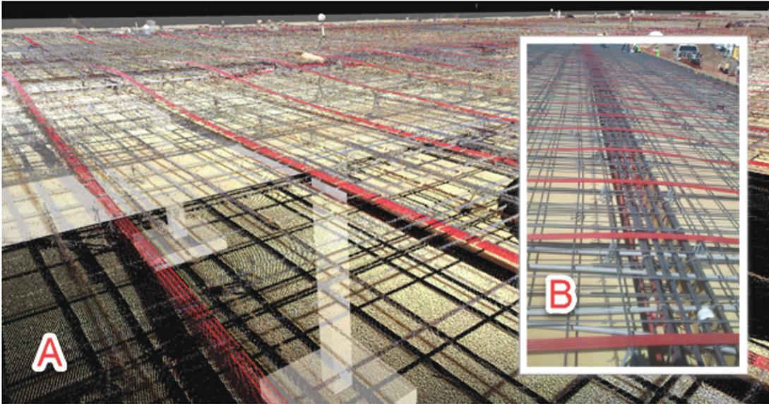 Figure 1 Laser scan by IKERD of the firm’s PT parking garage project with elevated retail above, circa 2013. The firm’s inhouse SE team coordinated the PT with their in-house reality capture scan team to aid the owner in developing an as-built PT tendon mapping for future coring of the slab. Laser scanning was performed the day before the pours of each section of the deck and brought into the 3D BIM models to develop LOD 350+ concrete BIM content. Such laser scanning technology as this has increased in efficiency and capability over the last decade since the data collected in the image above.