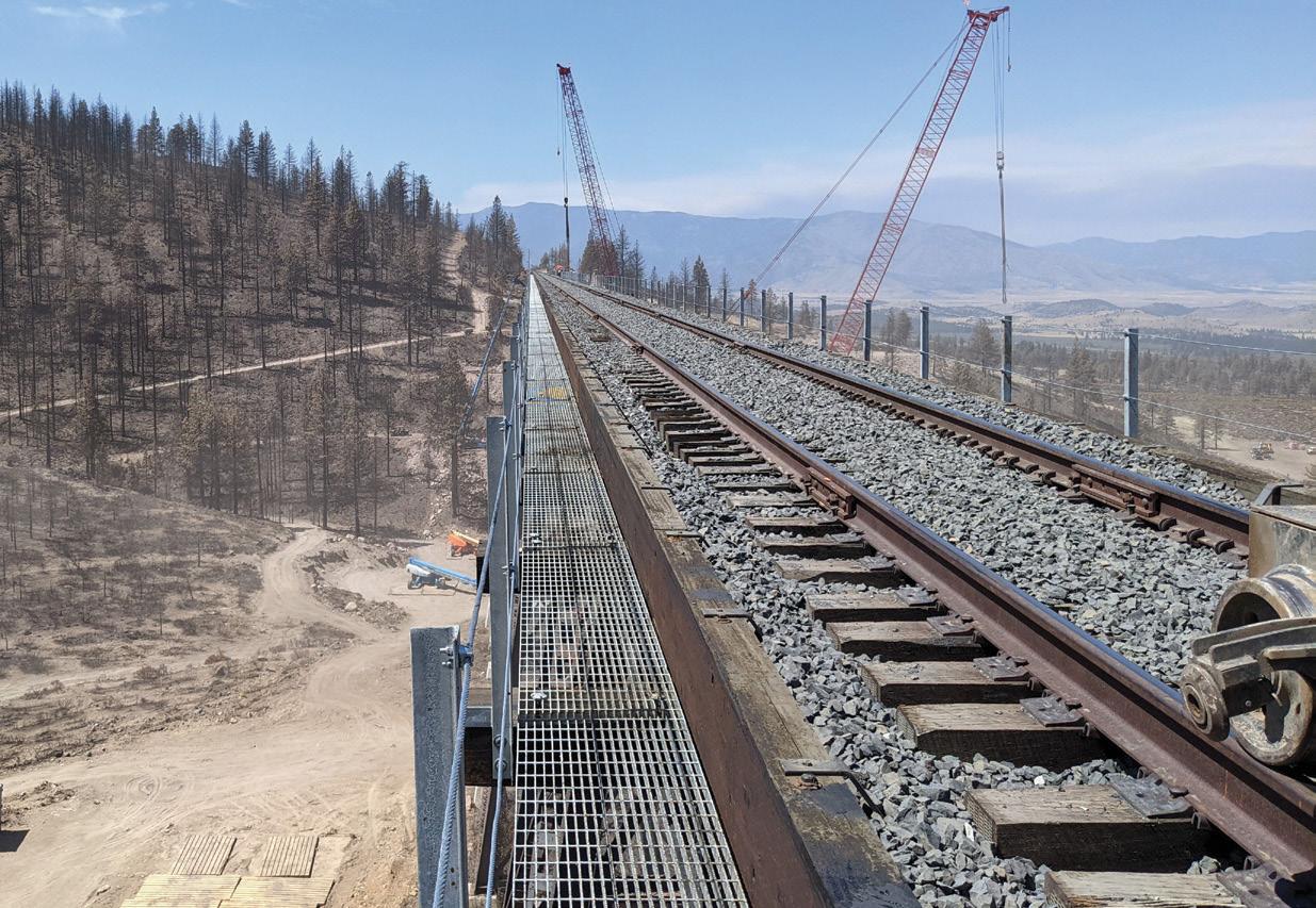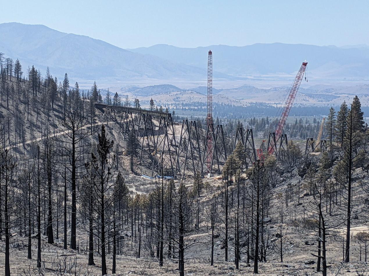 The 2021 Lava Fire heavily damaged multiple structures, including Union Pacific Railroad’s Dry Canyon Bridge near Weed, California. With 19 spans, the deck is a ballast deck with a timber ballast pan and curb. The superstructure consists of steel girders supported by steel bents. After the fire, nine spans needed to be replaced. The remaining ten spans were deemed salvageable through heat straightening.