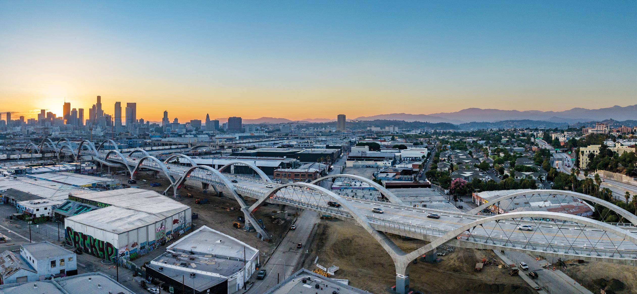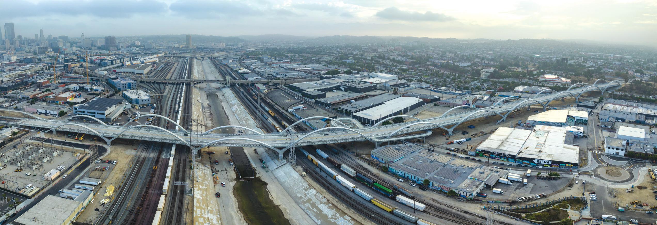 The iconic Viaduct over the Los Angeles River has served as a backdrop for dozens of movies, TV shows, and more. There was a strong desire to create an equally impressive replacement structure. The new “Ribbon of Light” comprises efficient thin profiles made possible by a network of cables that support the bridge deck beneath. The design solution creates a striking structure via the repeated use of a concrete network of tied arches flowing seamlessly into supporting Y-Bent substructures.