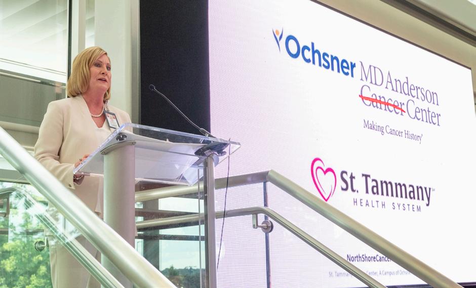 St. Tammany Health System President and CEO Joan Coffman speaks June 22, 2023, at an event held at St. Tammany Cancer Center – A Campus of Ochsner Medical Center at which the center’s affiliation with The University of Texas MD Anderson Cancer Center was announced. Read more on page 8.
