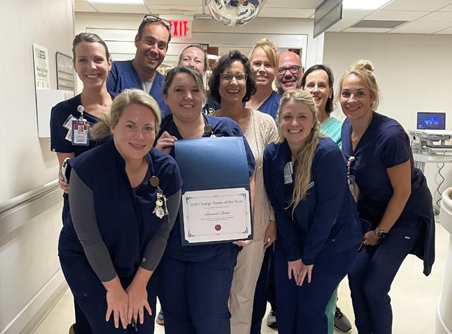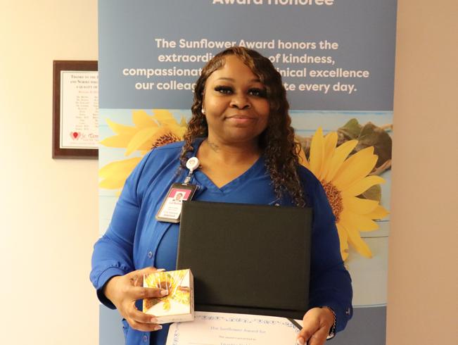 3) Emergency Department Charge Nurse Savannah Parker (holding certificate) poses with members of her team after being named STHS’s Charge Nurse of the Year for 2025. 4) Mother Baby Nursing Assistant DeeDee Jones, left, poses for a photo with former patient Camdyn Lloyd and baby Declan after learning she was named the recipient of the Sunflower Award for supporting the health system’s nursing mission. Camdyn nominated DeeDee for the honor. 5) Neurosciences Nursing Assistant Le’Ashia Fields poses with her Sunflower Award. Le’Ashia was nominated three times for the honor. 6) Members of the STHS Transitional Care and Communication teams pose for a photo after winning a 2025 eHealthcare Leadership Award for their digital efforts in the population health arena. 7) Adult Health nurse Cassie Currie accepts a hug — and a Daisy Award — from STHS Chief Nursing Officer Kerry Milton.