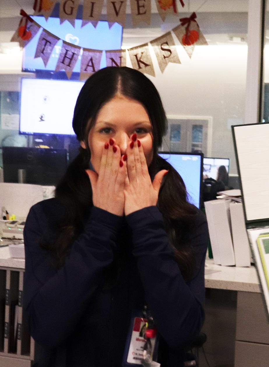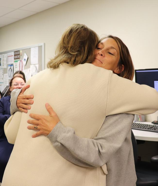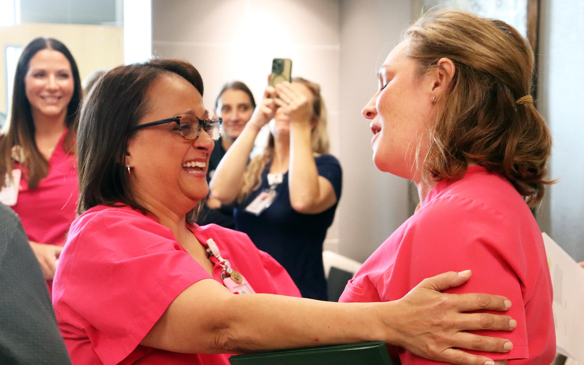 1) Adult Health nurse Meredith Davis reacts in shock after learning she won a Daisy Award for Extraordinary Nursing. 2) Women and Children’s Nurse Manager Emily Price, right, accepts a congratulatory hug from New Family Center nurse Winnie Hernandez after Price was announced as the recipient of the 2025 Daisy Nurse Leader Award. Winnie nominated Emily for the honor.