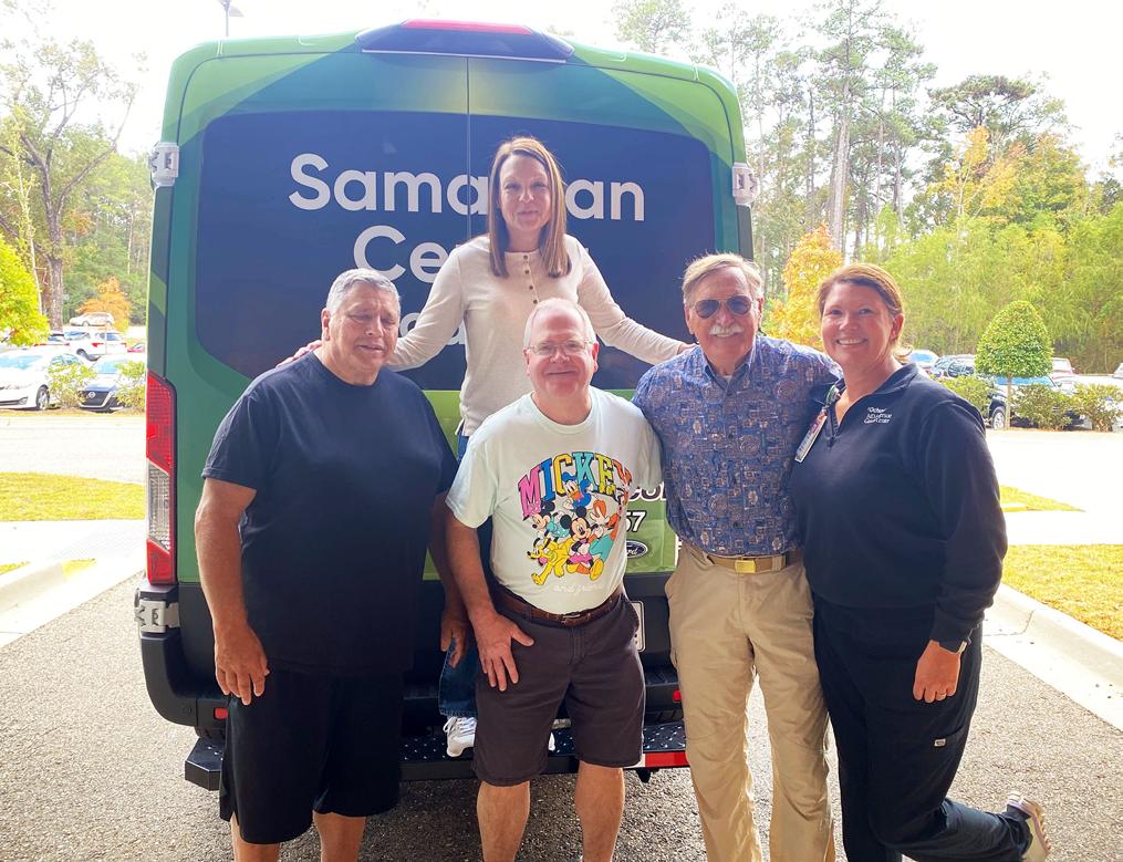 Samaritan Center volunteers pause from their work packing and delivering 120 Thanksgiving food boxes for distribution to cancer center patients.