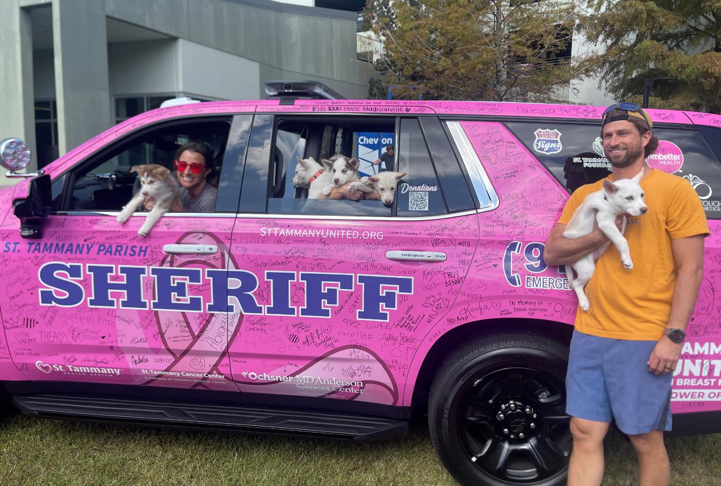 The St. Tammany Parish Sheriff’s Office (with help from a team of canines from a puppy yoga event at Chevron) raised $14,417.22 for the Power of Pink breast cancer campaign by allowing community members to sign a pink-wrapped sheriff’s vehicle for $5 each.