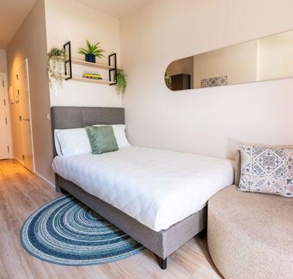 • Estudios compartidos diseñados para dos personas, con cocina y baño privados compartidos, litera, dos escritorios y espacio de almacenaje.