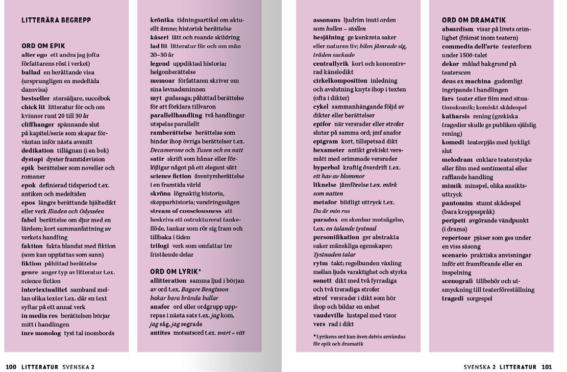indelning av epik, lyrik och dramatik och sätter berättelser, dikter och pjäser i historisk kontext. Varje epok följs av repetitionsfrågor och fördjupningsfrågor som följer Skolverkets krav på utveckling av läsförståelse, förmåga att sätta texter i sammanhang och utveckling av kunskaper om stilar, genrer och tongivande författarskap.