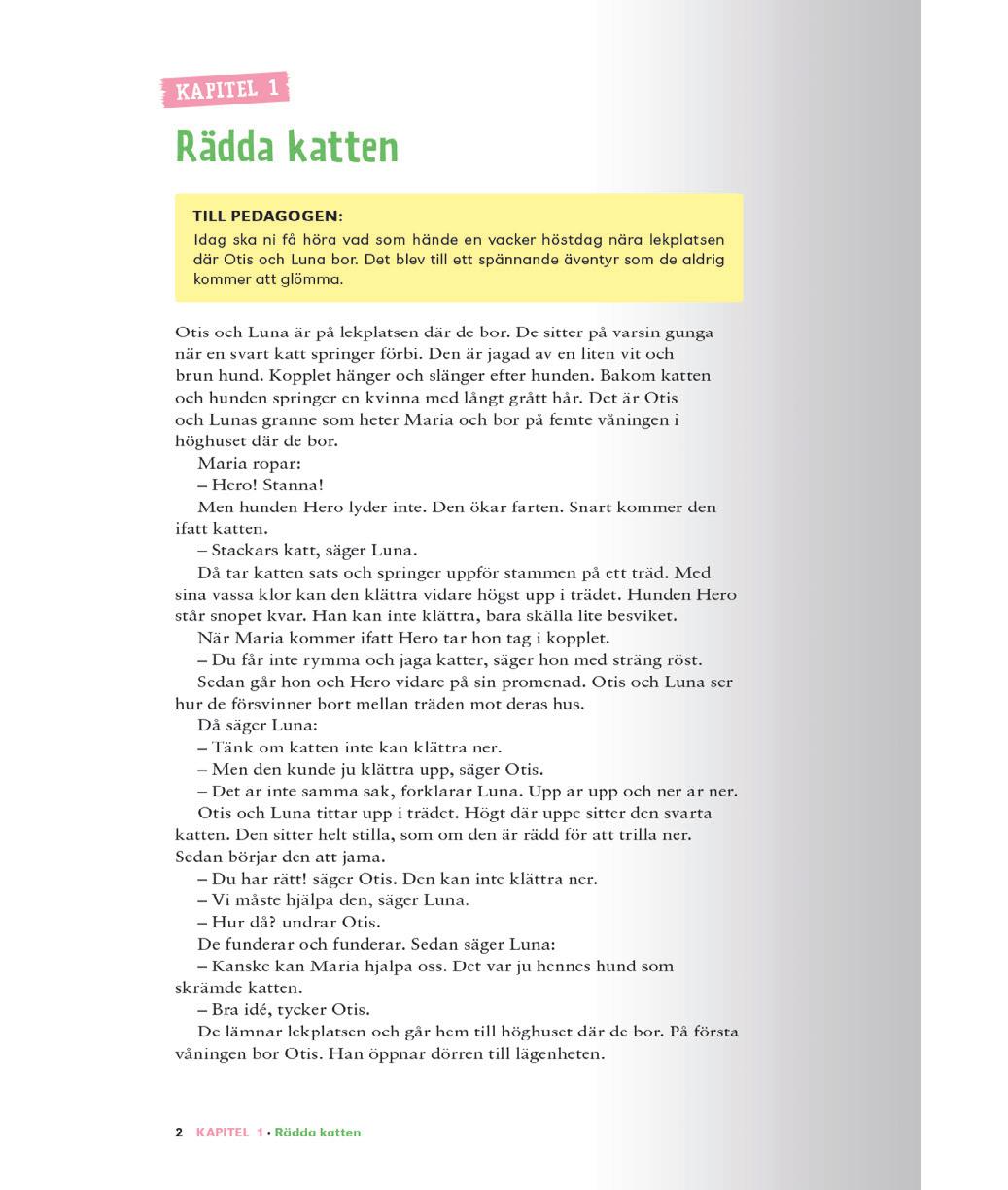 I högläsningsboken, som är skriven av Torsten Bengtsson och illustrerad av Veronica Ljunglöf, får eleverna träffa Otis och Luna för första gången. De är kompisar och bor i samma hus. Tillsammans ger de sig ut på vardagsnära äventyr som till exempel när: