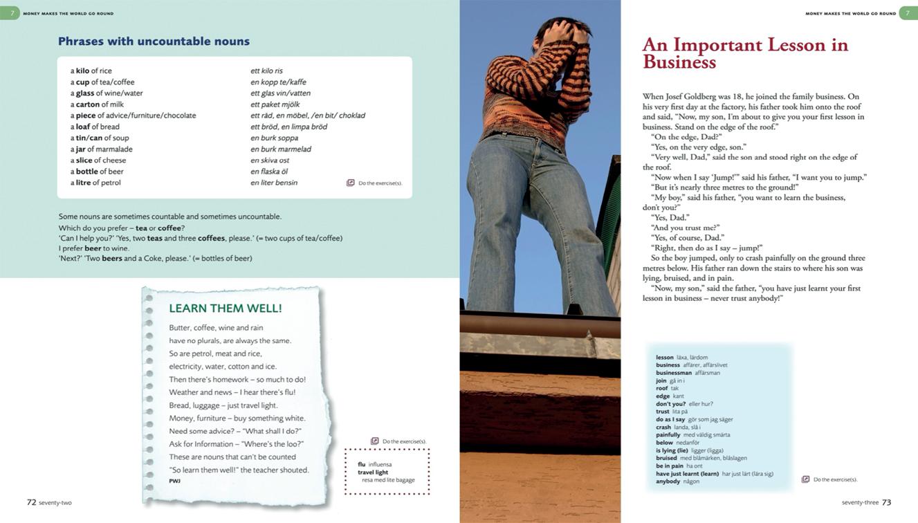 Samtliga texter, övningar och resurssidor är inlästa med autentiska röster och textföljning. Här finns också självrättande grammatik, uttals och ordövningar för mängdträning.