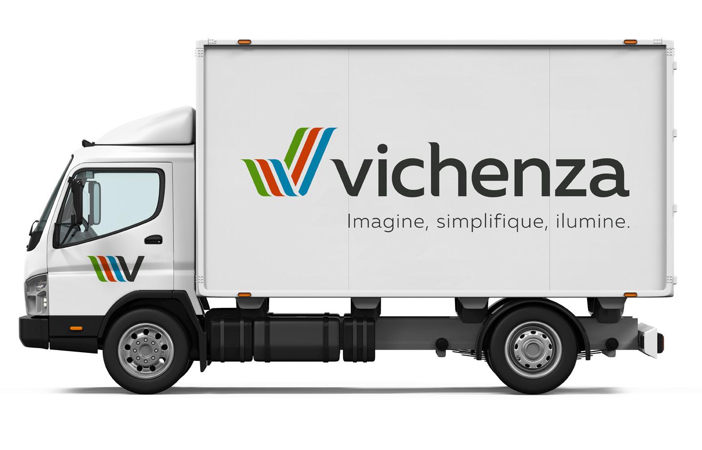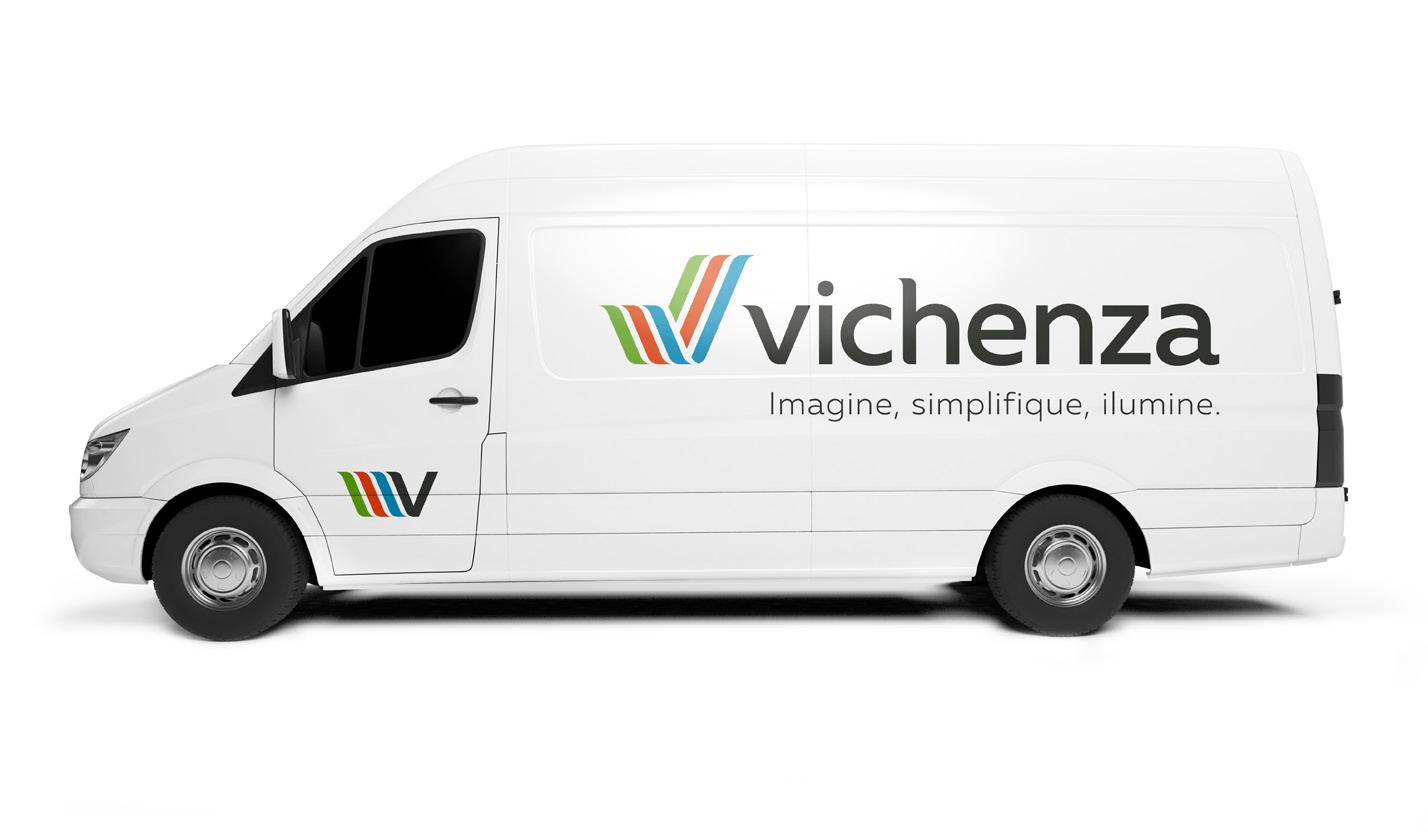 A marca possui 2 elementos: ícone e tipografia. O ícone tem 2 significados: representa o “V” da Vichenza, mas também é a tradução do reflexo da luz. A tipografia é a parte escrita que, com a escolha dessa tipologia, traz à marca a modernidade de um tipo contemporâneo.