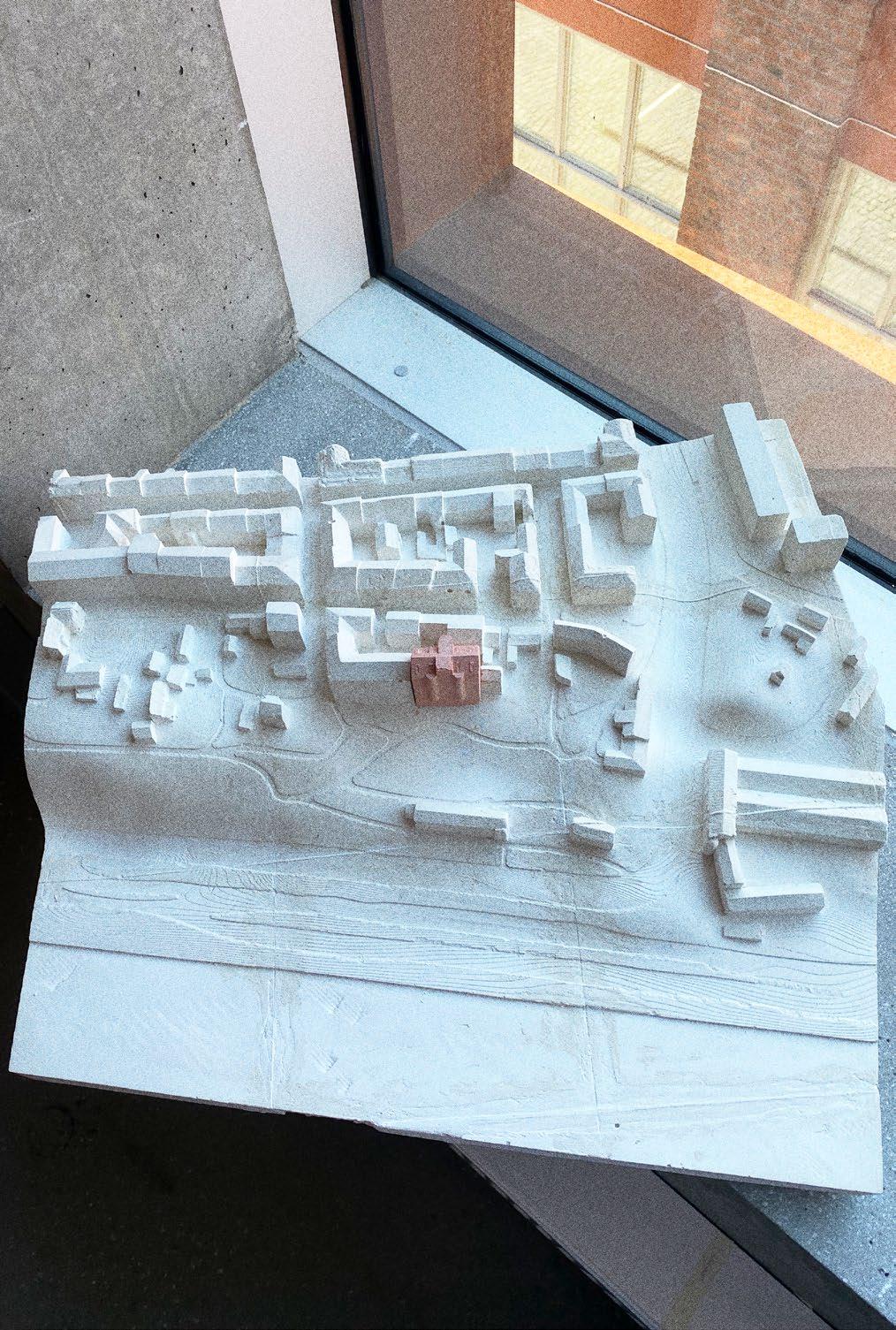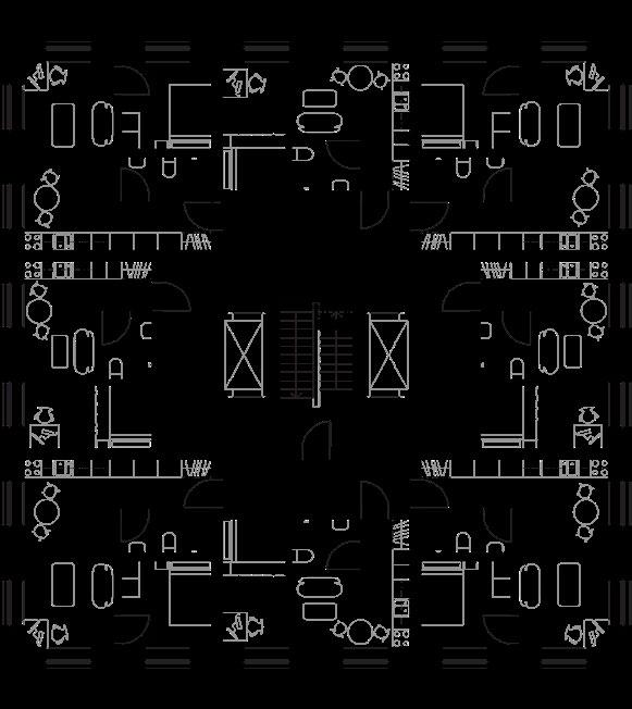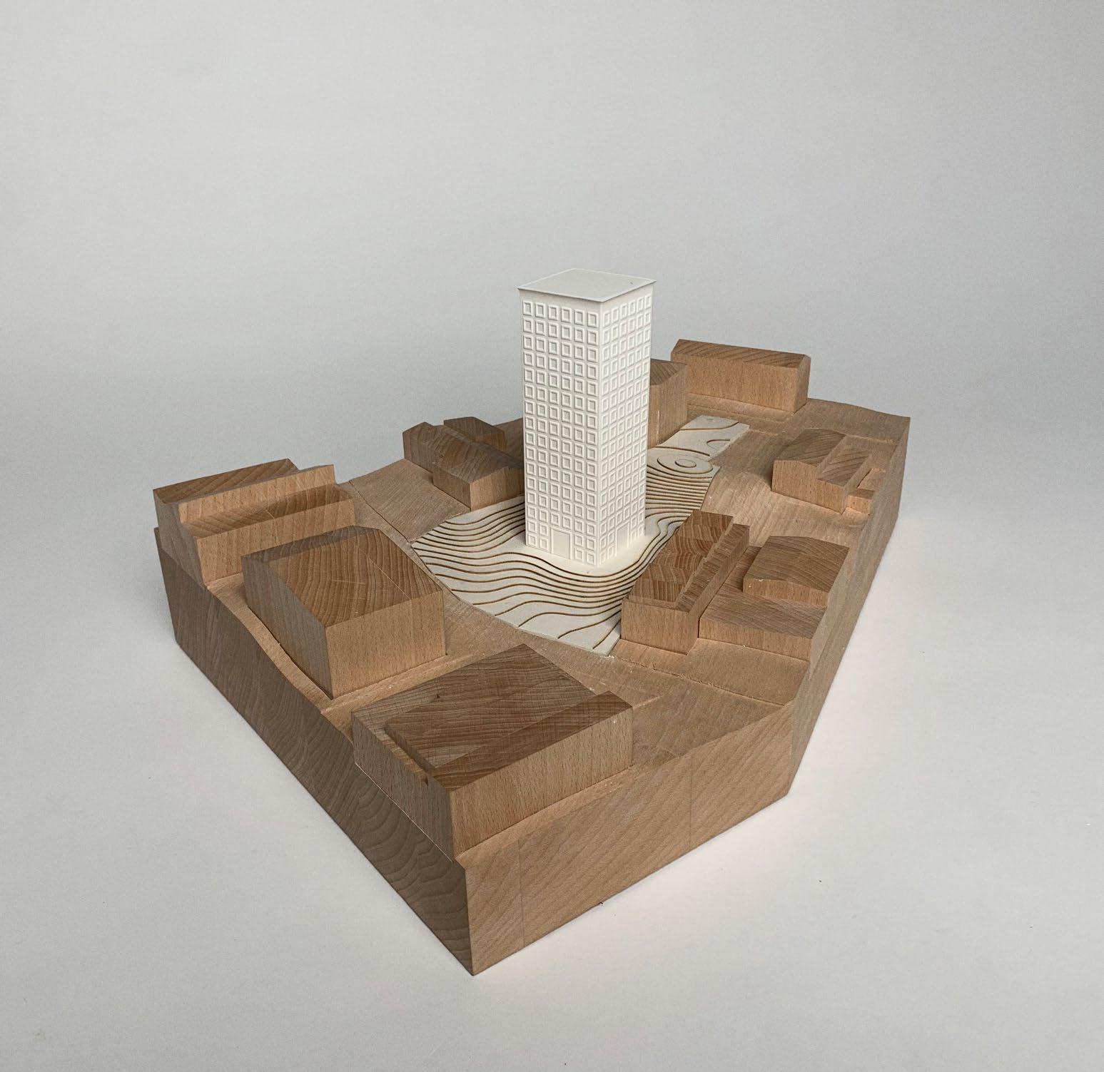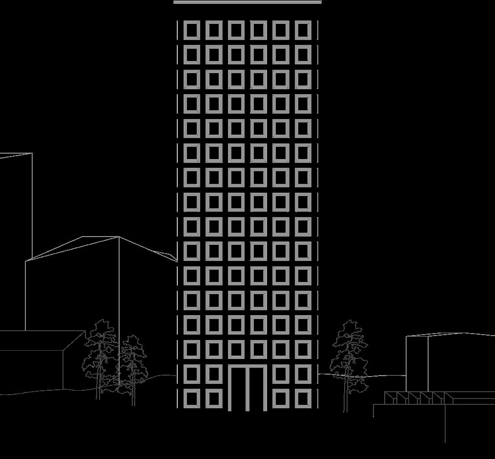 N.Djurgården 1:49 is a project situated in the heart of KTH-campus in Stockholm. The program consists of 16 stories of student housing with a building footprint constraint of 20x20 meters. Furthermore, the loadbearing structure of the building has to be composed mainly out of cross laminated timber elements. The project plays on the architectural ambiguity of its surrounding where each existing building has no clear relation to one another. Some buildings are old, while some are very recent in execution, giving the area an interesting mix in aesthetics. The idea was to follow this “theme” of the area while still upholding a sense of relatabilty to the city of Stockholm and its architecture. The result was comprised of a rendered facade in an earthy-orange colour (a colour which is very typical for the “Stockholm-palette” of the buildings in the city), adorned with oversized, protruding window frames, giving the fenestration of the buildning a bold and different aesthetic compared to its surroundings. Lastly, the crown of the edifice features overhanging eaves which encompasses the project with a type of post-modern aura.