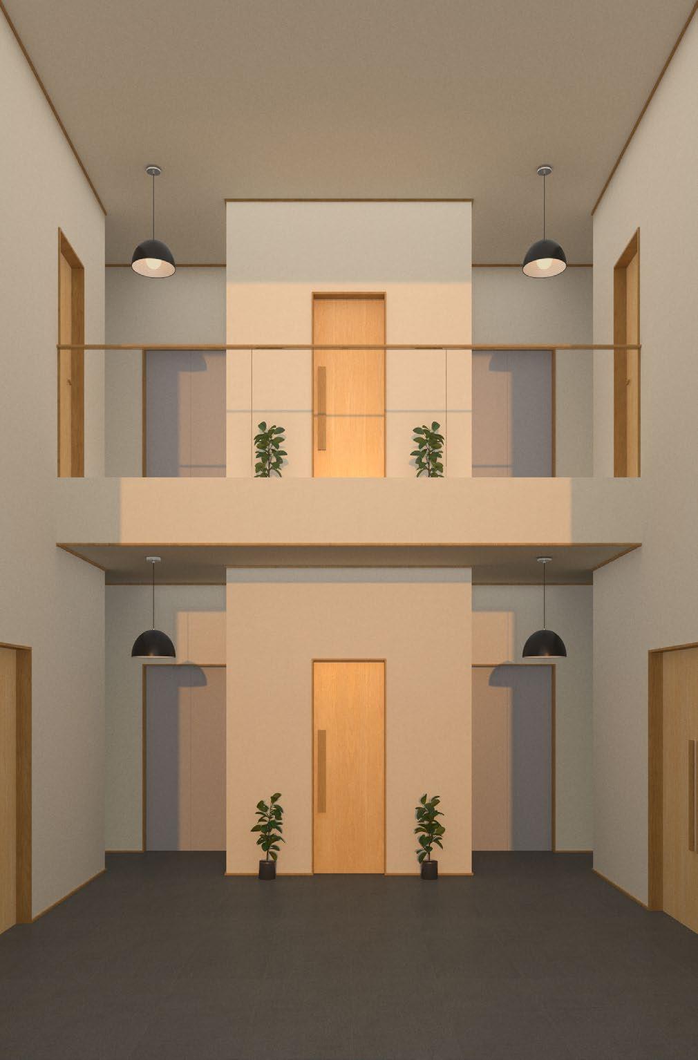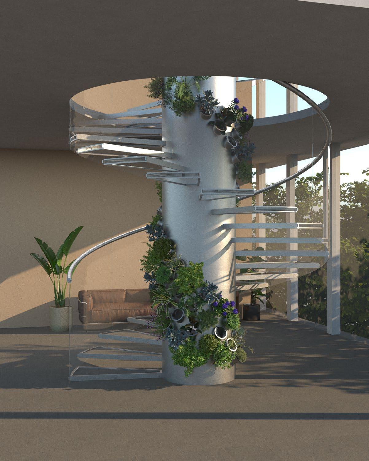 The idea plays on the future of a self-sustaining household, where one could farm all year round, despite the weather or geographical location. So how can one make this happen? The proposed idea is to combine the staircase as a vessel for hydroponic farming. This is done by housing a water pump and sprinkler system inside the loadbearing shaft of the staircase, aswell as a helix-like pattern of perforations where you can place notched pots with seeds or saplings inside. The sprinkler system then irrigates the pots from the inside of the shaft, in specific time intervals, allowing for a vertical hydroponic farm. Light is either provided naturally (location of staircase) or artificially by the use of portable UV-lights, where you can customize the light-allocation for your specific crops needs.