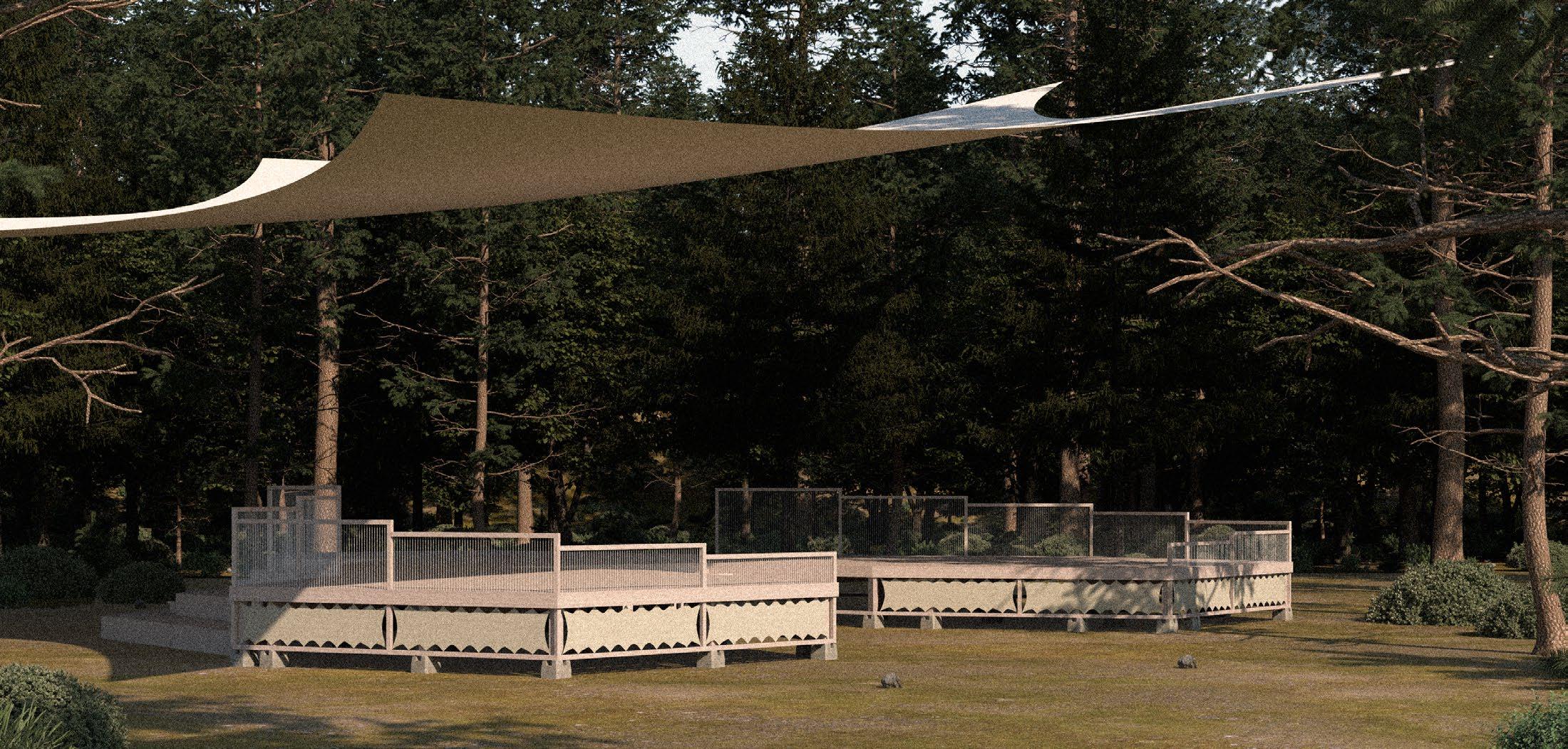 Canopy was our submission for the Sansusi Sound sculpture competition. The task was to design an outdoor stage for the Sansusi festival in Latvia for musicians to perform on. The competition called for an additional function of interactivity in the form of “a stage capable of generating sound”, therefore encouraging the audience to engage with the music and the musicians rather than just being spectators. Our proposal makes this interaction possible by integrating a harp-like strung frame that sits on top of the stage aswell as cladding the base of the stage with tensioned drum-skins. This play of different musical elements provides a new dimension to what it means to be an audience member but also a performing musician. The stage also had to be easy to assemble and disassemble due to the temporary nature of the event, which we solved by designing the stage with a means of simple timber decking.