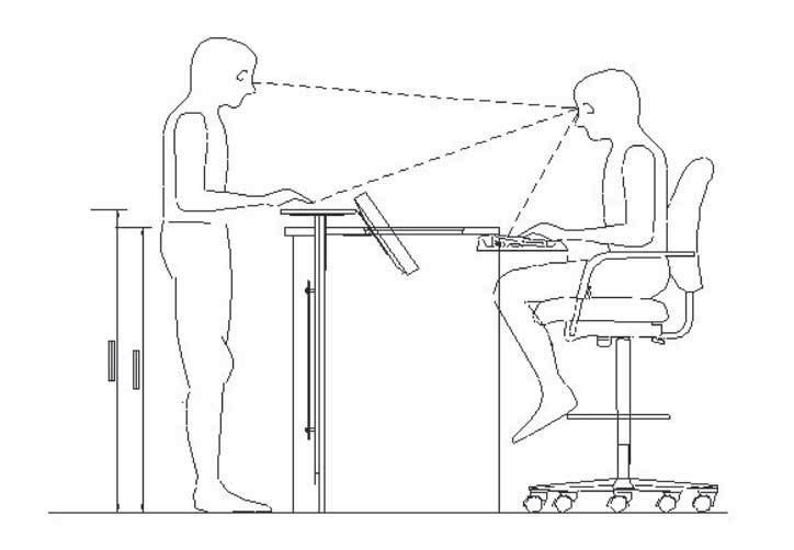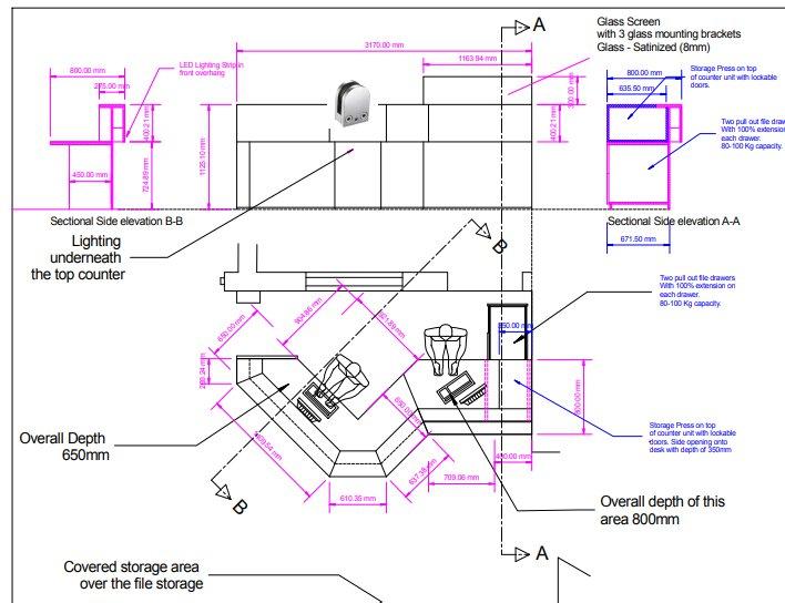 The above ergonomic study was used to illustrate to the client the user (staff) feedback. It denotes the height at which they wished to greet the public. It shows the PC semi submerged on an adjustable fitting and the raised height of the computer floor under the user.