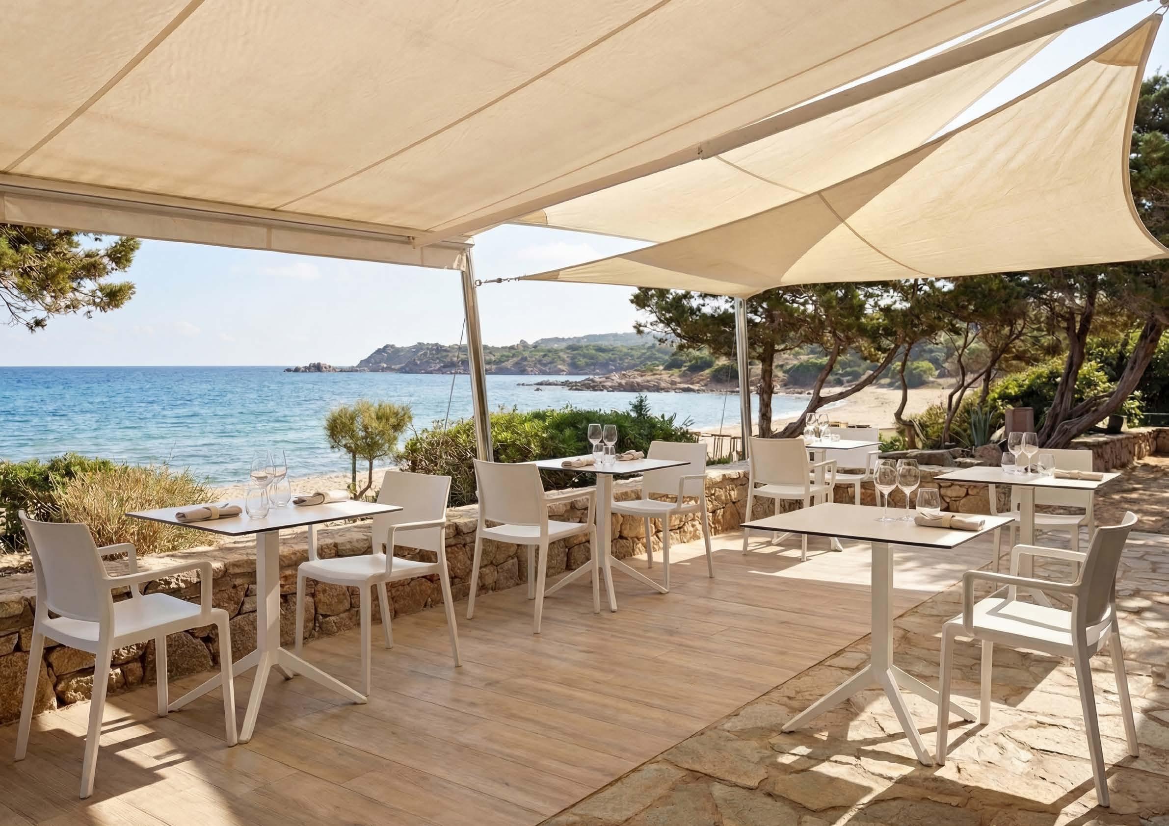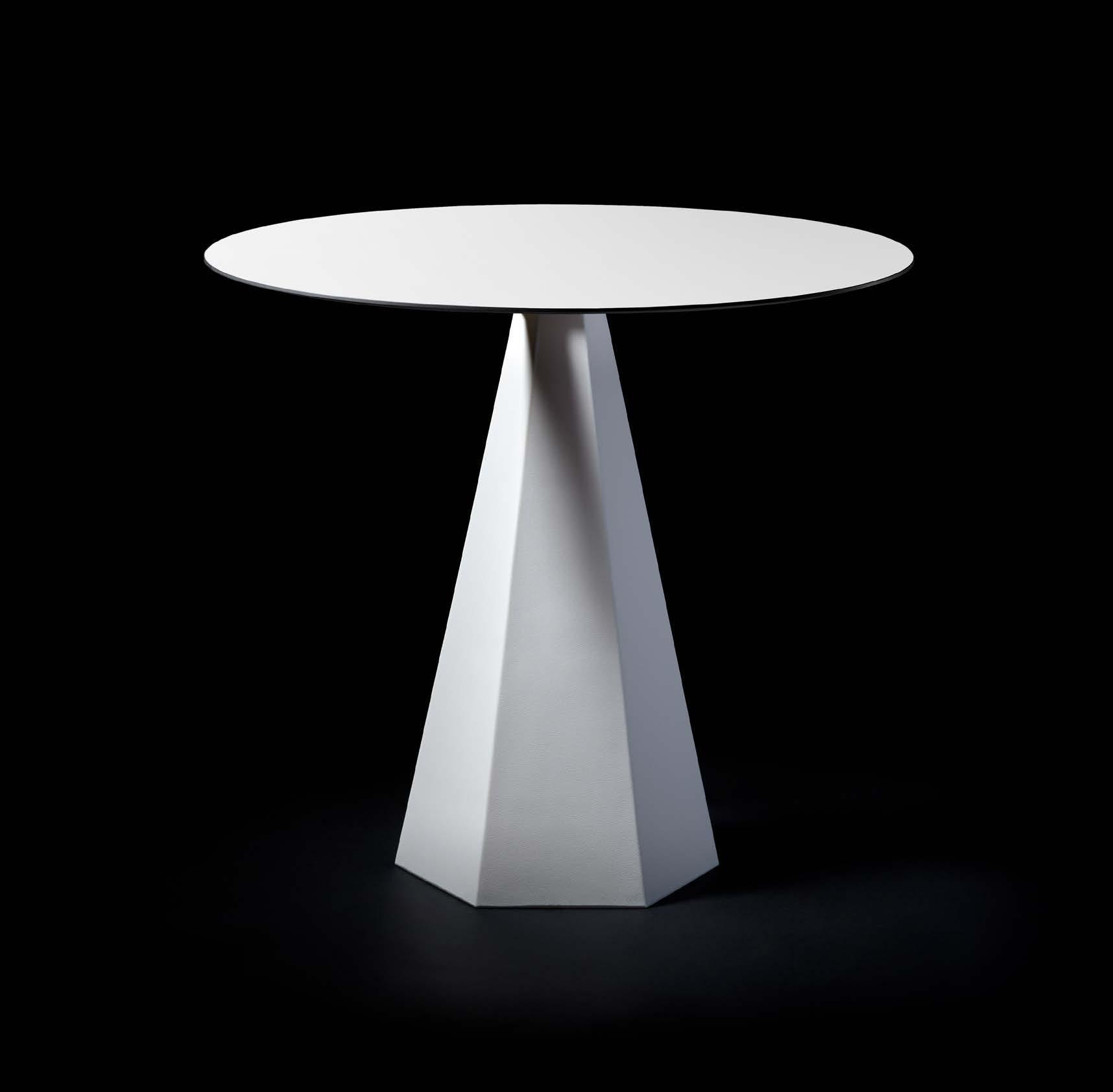 Il tavolo Blade Runner unisce base e piano rotondo HPL bianco in un segno essenziale e armonioso, trasformando gli spazi outdoor in ambienti moderni e accoglienti.
