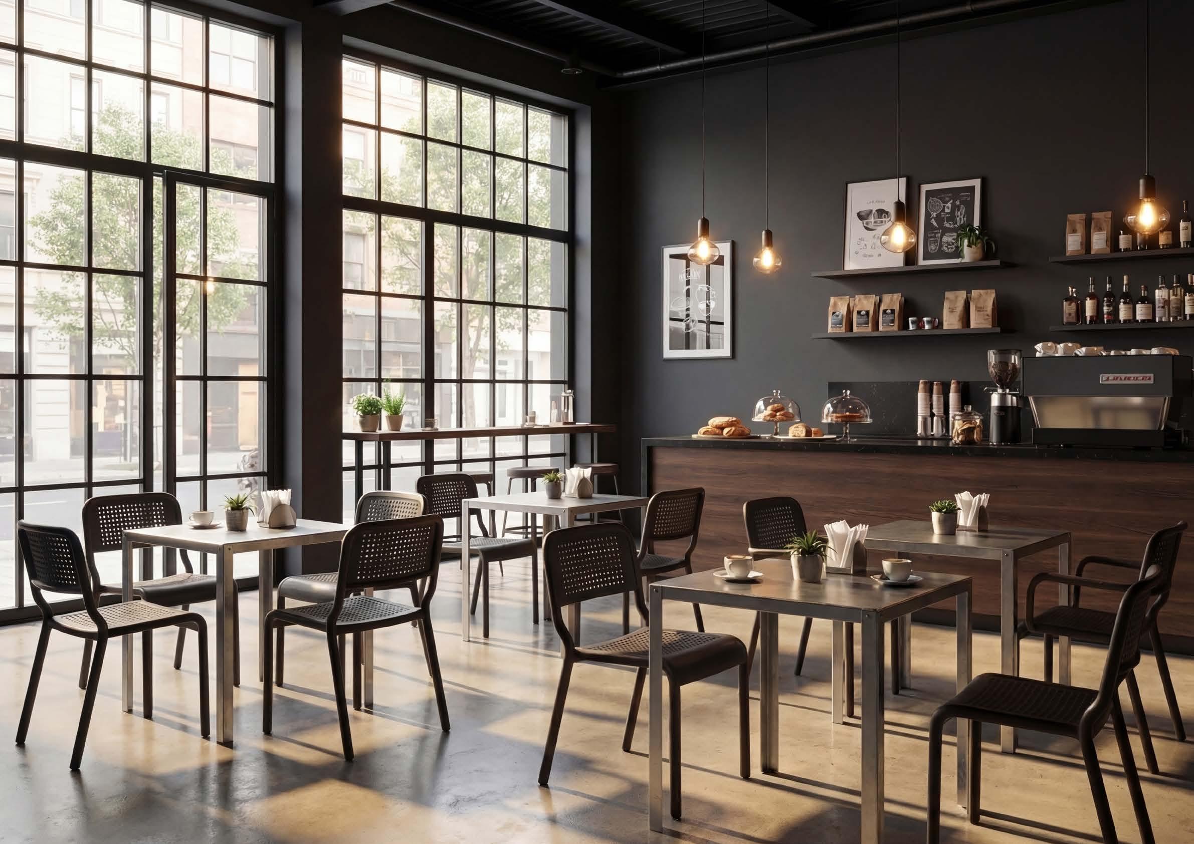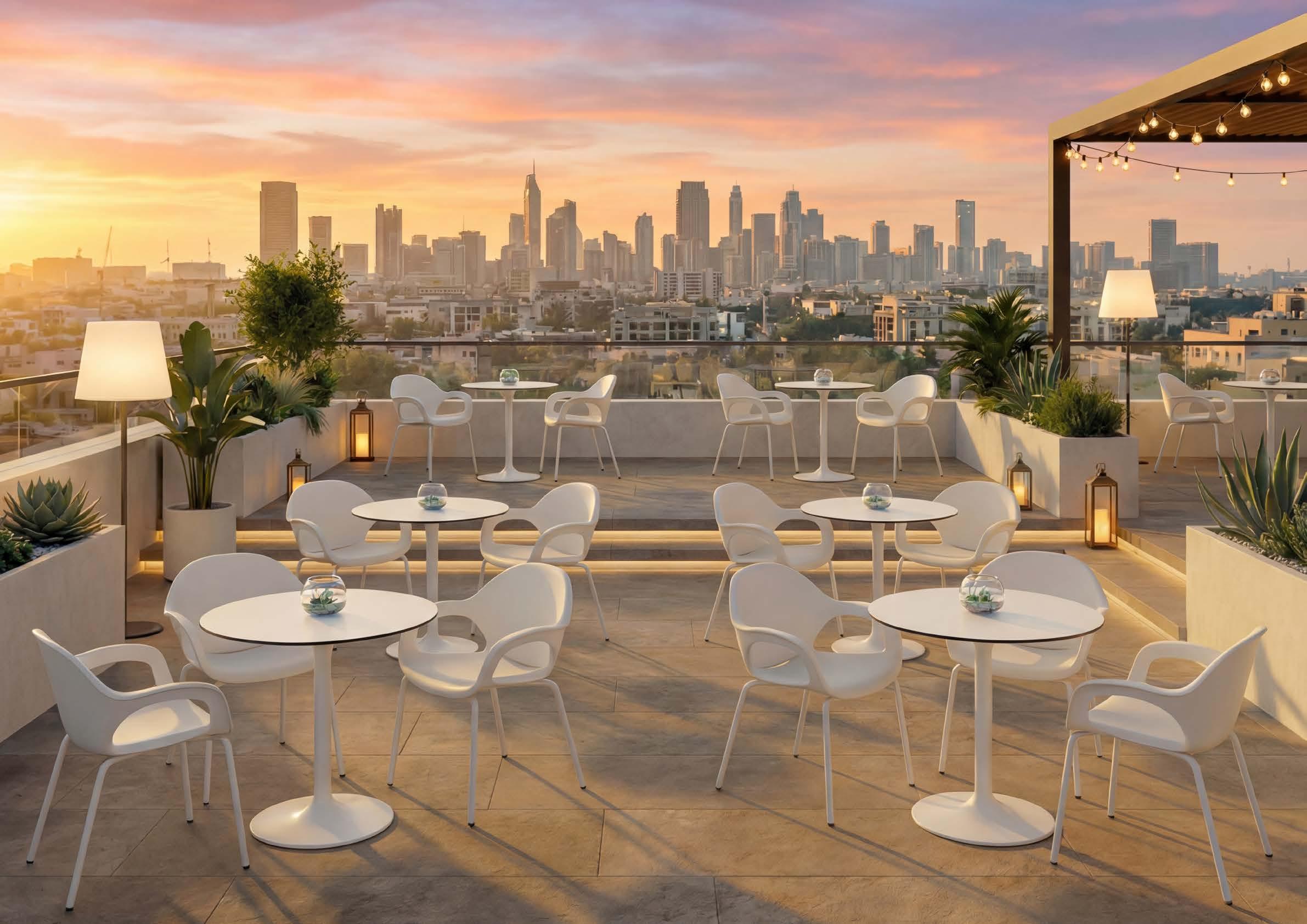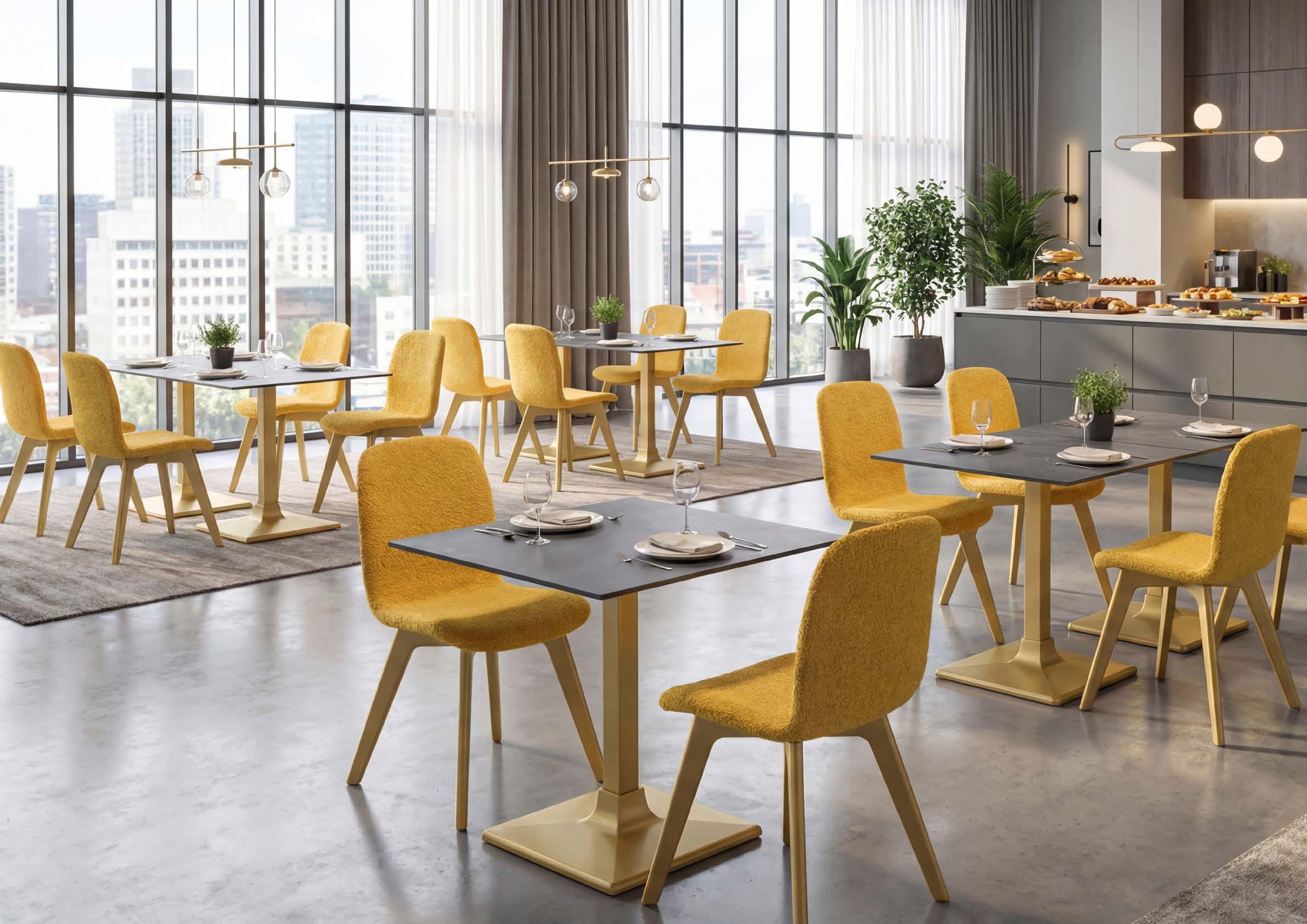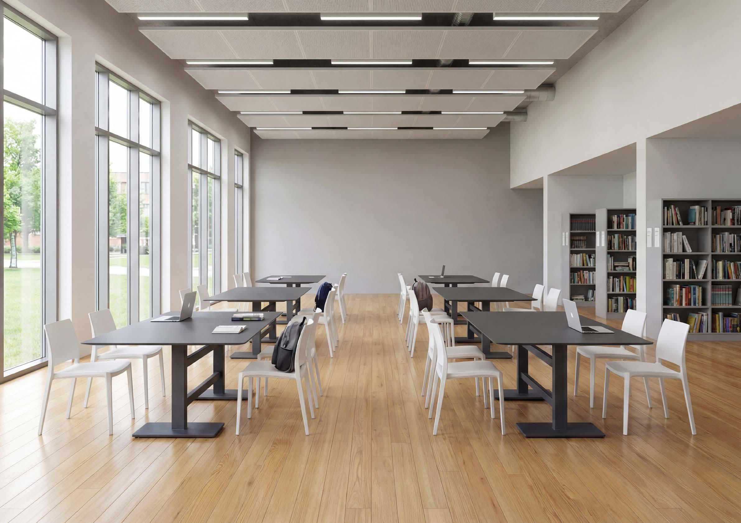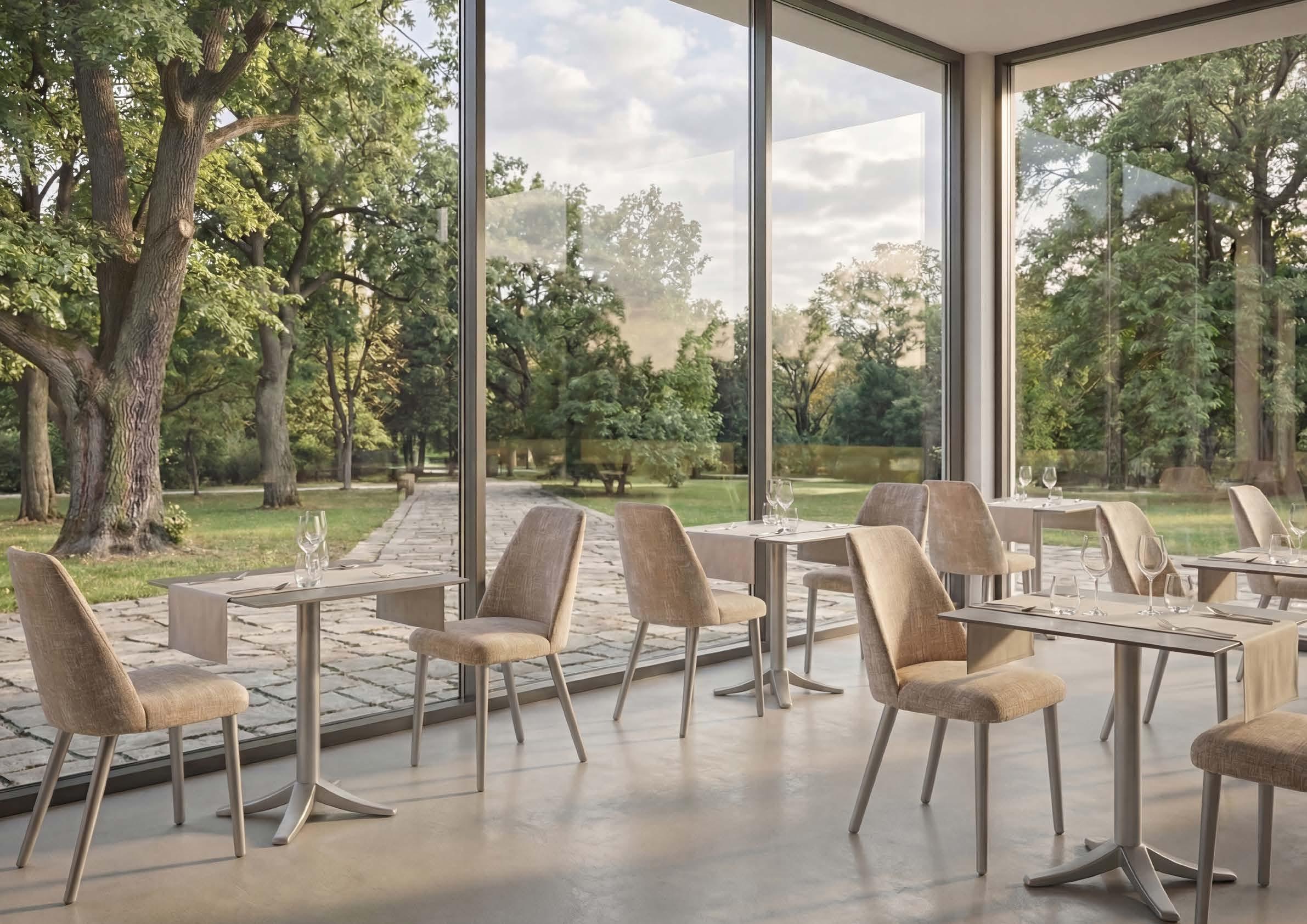 The Q Inox line shapes spaces with clean geometries and essential lines. Steel bases and columns convey strength and refinement, creating environments that are orderly, balanced, and visually harmonious.