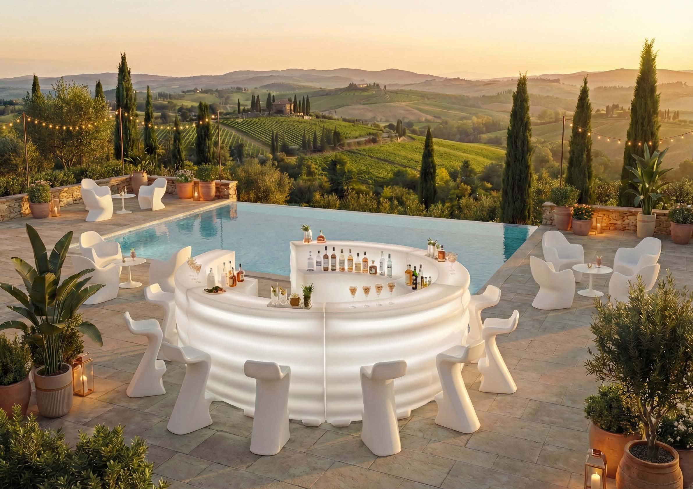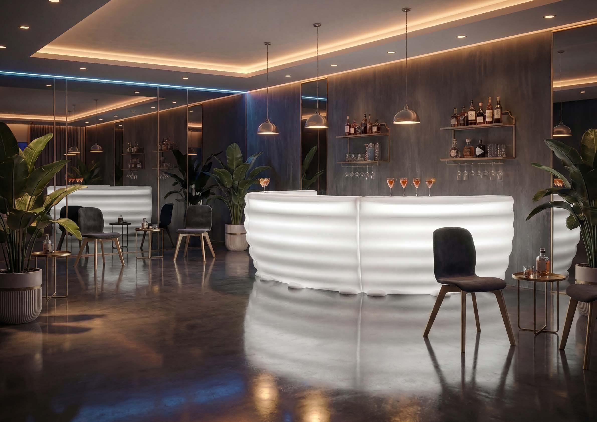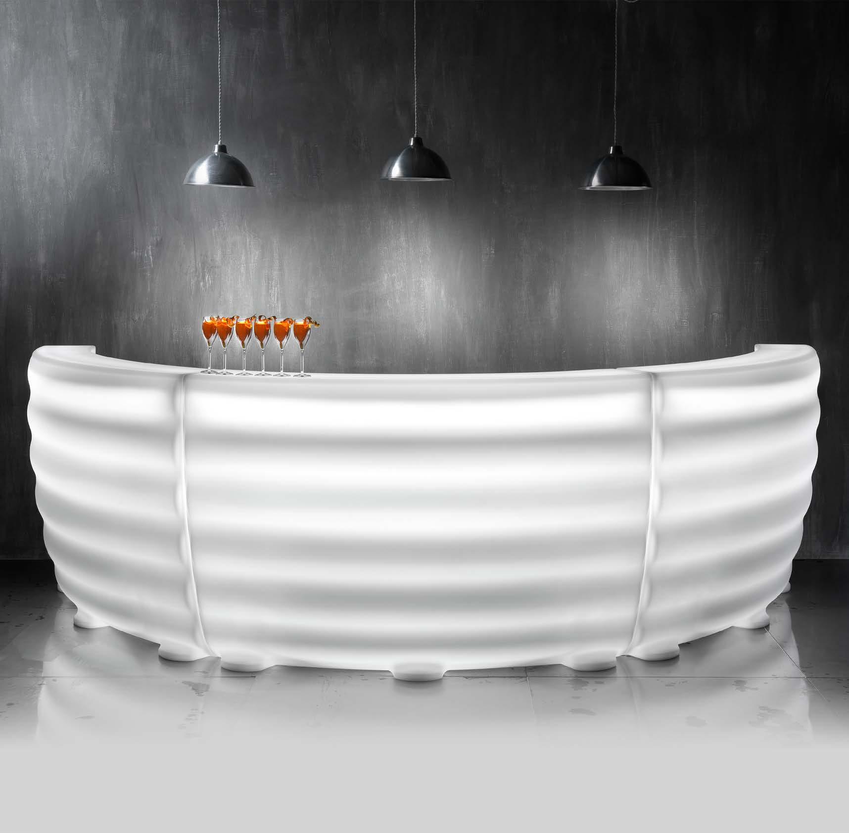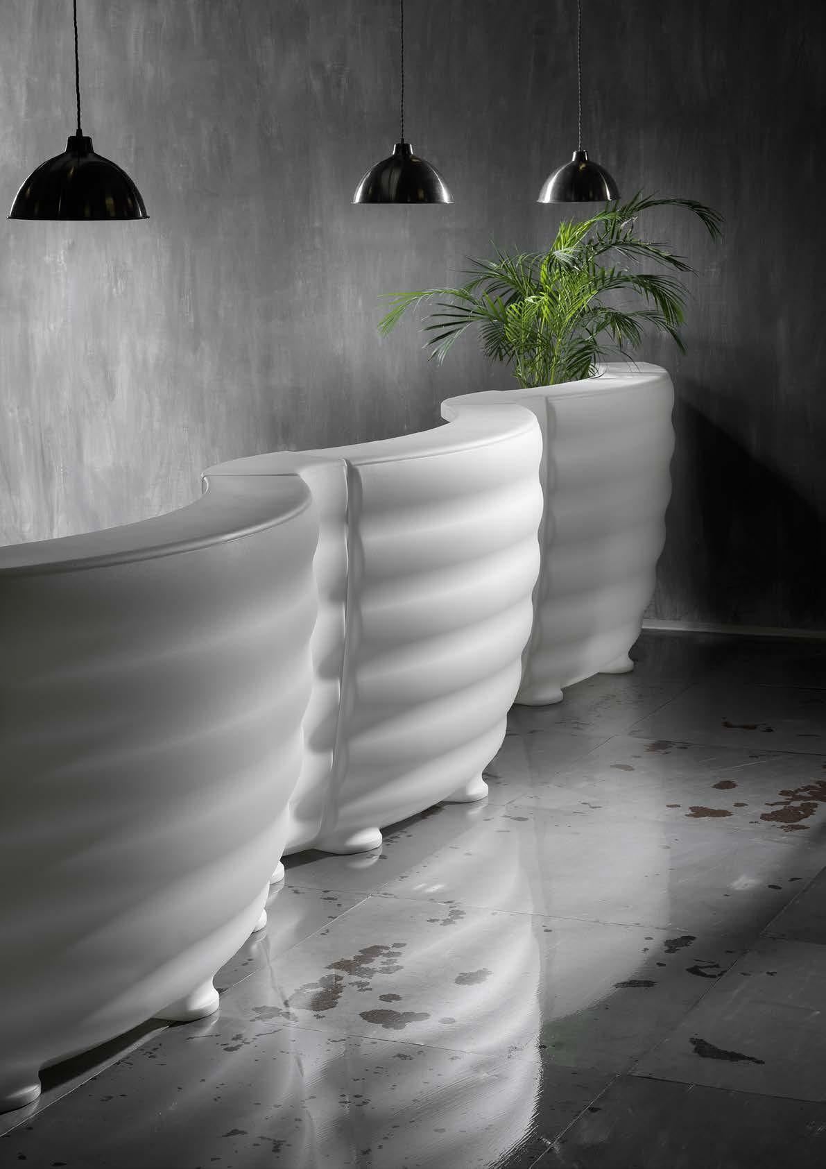 Androyd trasforma il bancone in polietilene in un elemento scenografico, modulabile e versatile. Il design scultoreo crea giochi di luce e invita a creare composizioni sempre nuove.